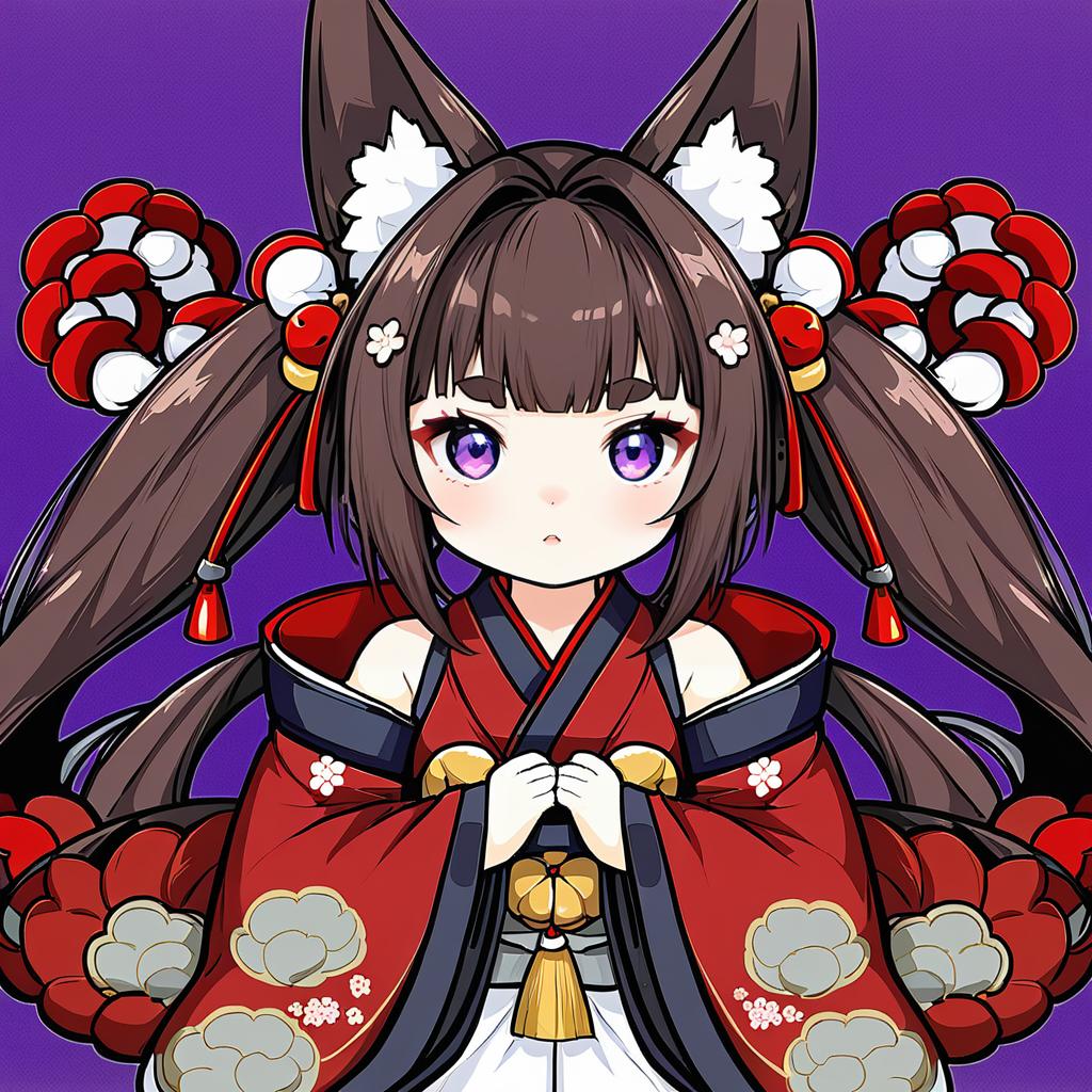 Amagi-chan (azur lane), azur lane, 1girl, fox girl, fox ears, fox tail, animal ear fluff, purple eyes, thick eyebrows, eyeshadow, brown hair, long hair, twintails, blunt bangs, sidelocks, hair ribbon, kimono, kimono, wide sleeves, long sleeves, detached sleeves, kyuubi, shimenawa, by artist saku anna, leet