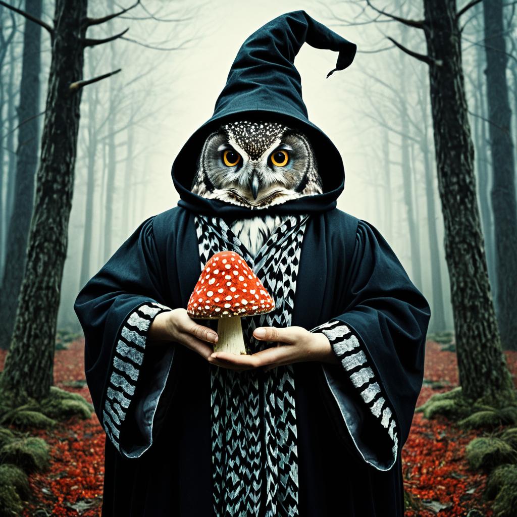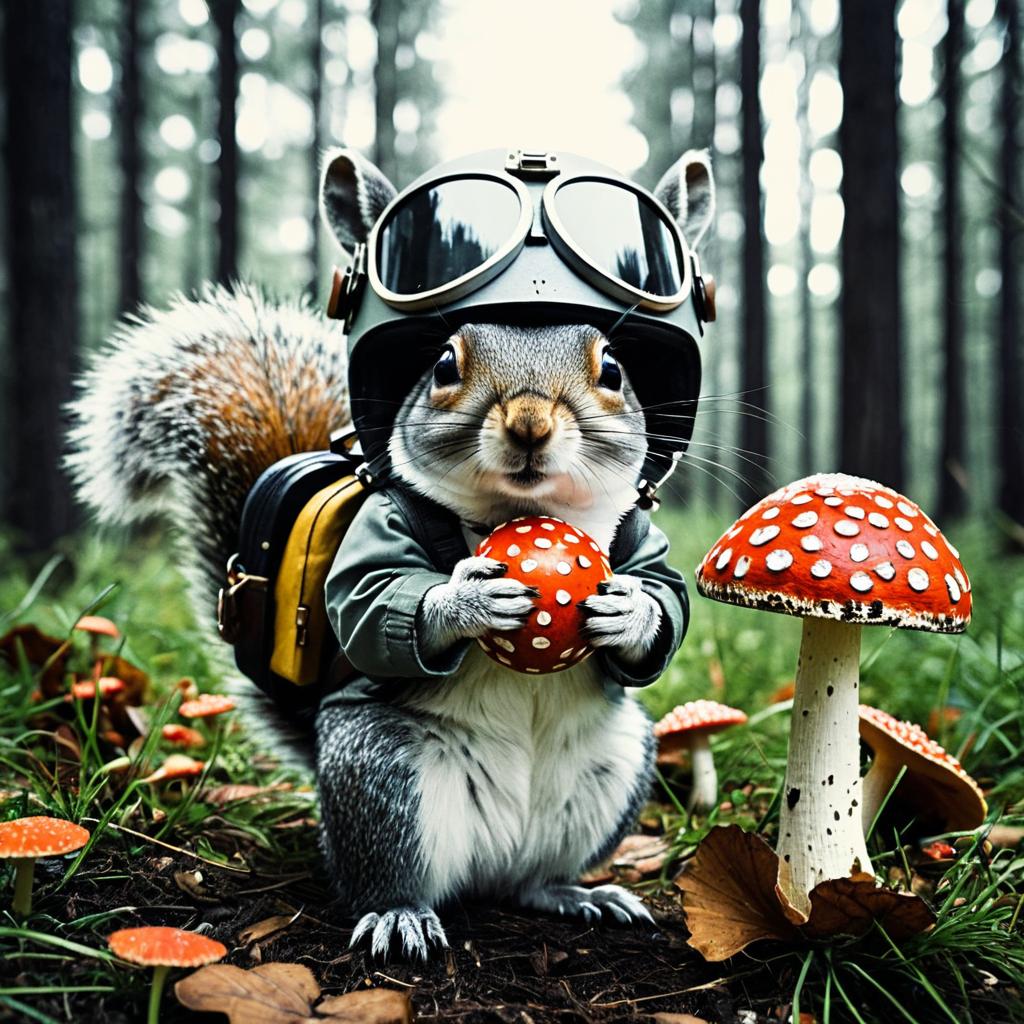 A surreal and playful image of a raccoon standing in a forest, dressed in a gray coat and a black-and-white striped scarf, holding two large Amanita muscaria mushrooms with red caps and white spots. The raccoon has detailed fur and expressive eyes, blending realism with artistic surrealism inspired by Salvador Dali.