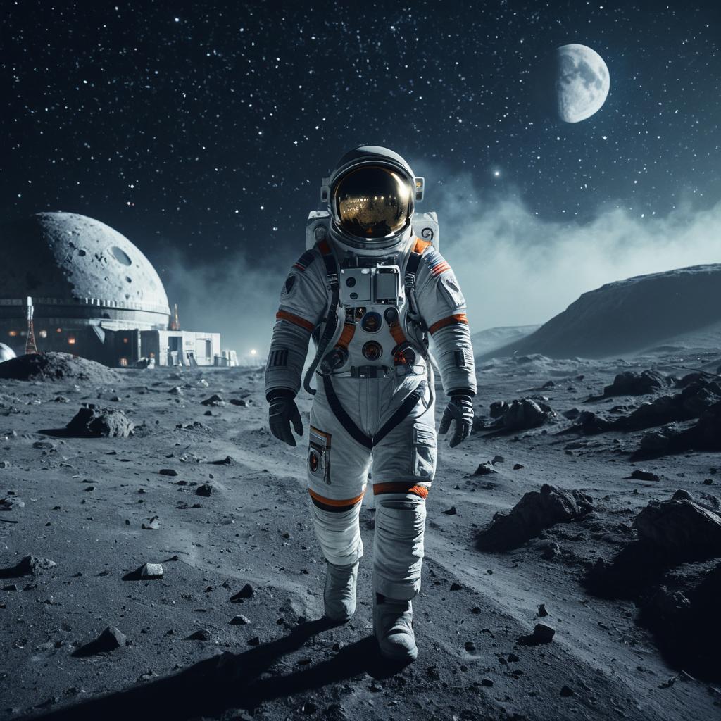 Afronaut in a vintage spacesuit roaming forgotten lunar base under a starry night sky, epic full shot with cinematic twilight lighting and volumetric fog, octane render, ultra-realistic photorealistic 8K hyper-detailed textures, award-winning ArtStation quality.
