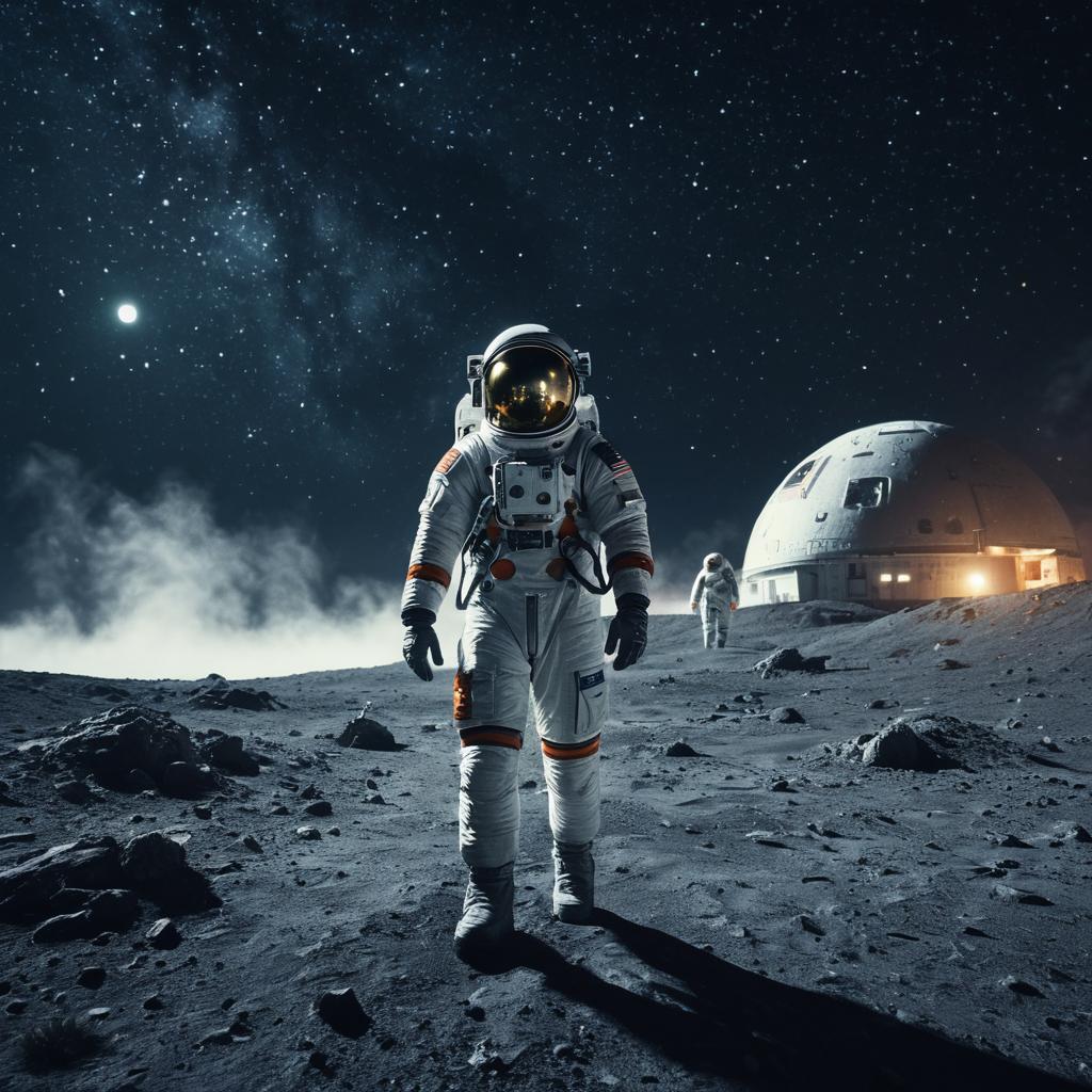 An astronaut in a vintage white spacesuit with American flag patches walks on the surface of a moon-like landscape. The scene features a starry night sky with a visible crescent Earth in the background, futuristic habitats, and soft twilight lighting with volumetric fog creating an epic atmosphere.