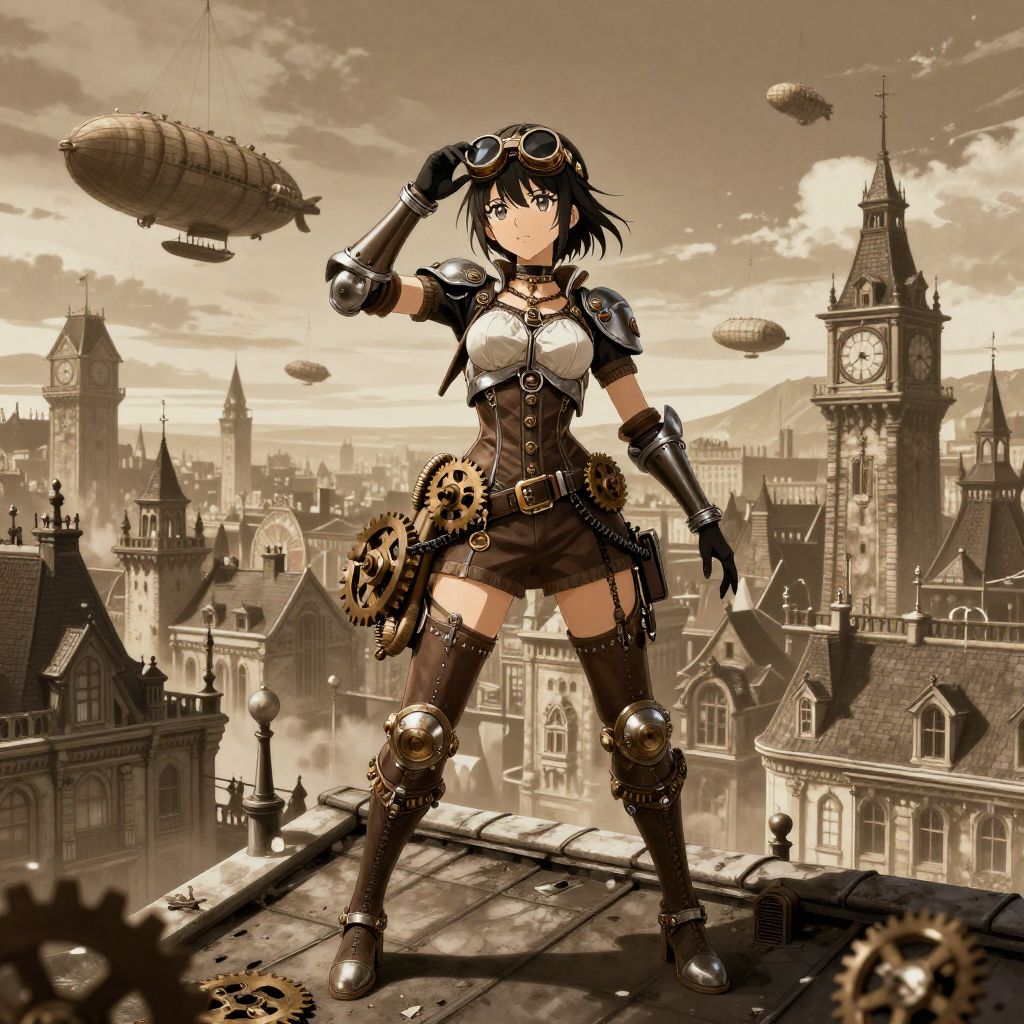 Anime steampunk girl standing on a rooftop overlooking a bustling Victorian city, intricate gears and goggles, metallic arm enhancements, rich sepia tones, detailed background of steam-powered airships and clock towers, dynamic pose, dramatic lighting.