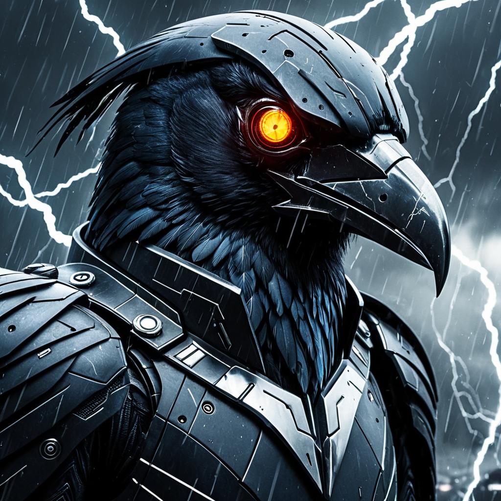 Hyperrealistic concept art of a futuristic android raven with sleek black chrome armor and intricate mechanical details. One glowing orange eye emits lightning in a stormy, rain-soaked environment. The design features lifelike feathers blending with advanced robotic plating, creating a dramatic and intense expression.