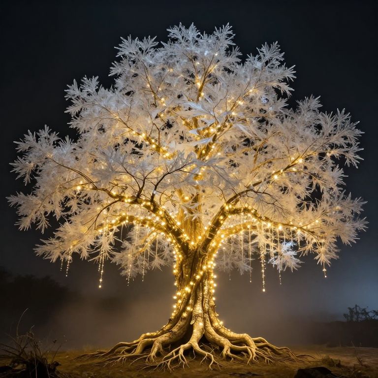 Illuminated branches of a majestic crystalline tree extend outward, adorned with golden lights that cascade down its trunk and roots, creating a radiant spectacle against the dark, misty backdrop.