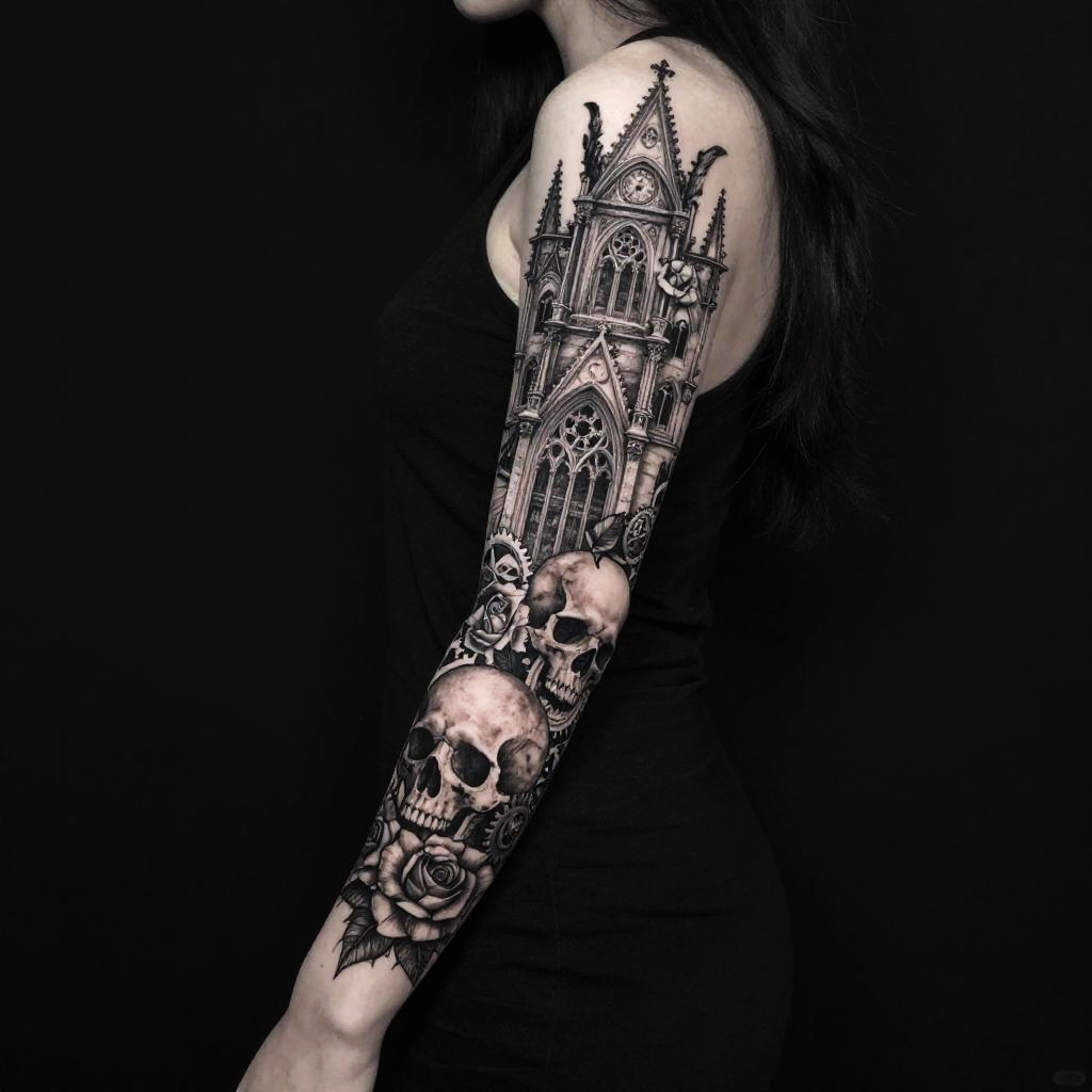 Gothic tattoos for females, intricate sleeve design featuring gothic cathedral elements, skulls adorned with roses, clockwork gears, and dark angel wings, dynamic shading and a mix of sharp and soft lines to capture gothic beauty and strength