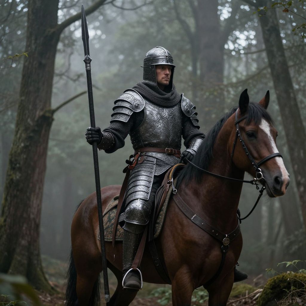 A Getman warrior on horseback in a dense, misty forest, clad in medieval armor with intricate engravings, wielding a long spear, dramatic lighting filtering through the trees, atmospheric and moody, highly detailed textures and natural colors.