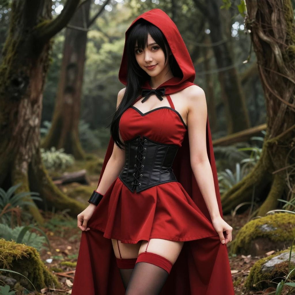 RedHoodWaifu, 1girl, (8k, RAW photo, best quality, masterpiece:1.3), (ultra highres:1.2), detailed illustration, (real person, fashion photography portrait, photograph), detailed, detailed beautiful skin, (realistic, photo-realistic:1.37), standing, (looking to the viewer), (red hood, cape, corset, dress), (red skirt:1.2), naughty smile, hood, back hair, sleevless, wristband, complicated forest, detailed landscape background, professional lighting, eyelid, eyelashes, lipstick, (knees angle), (black stocking:1.2), skirtlift, (little red panty:1.2)