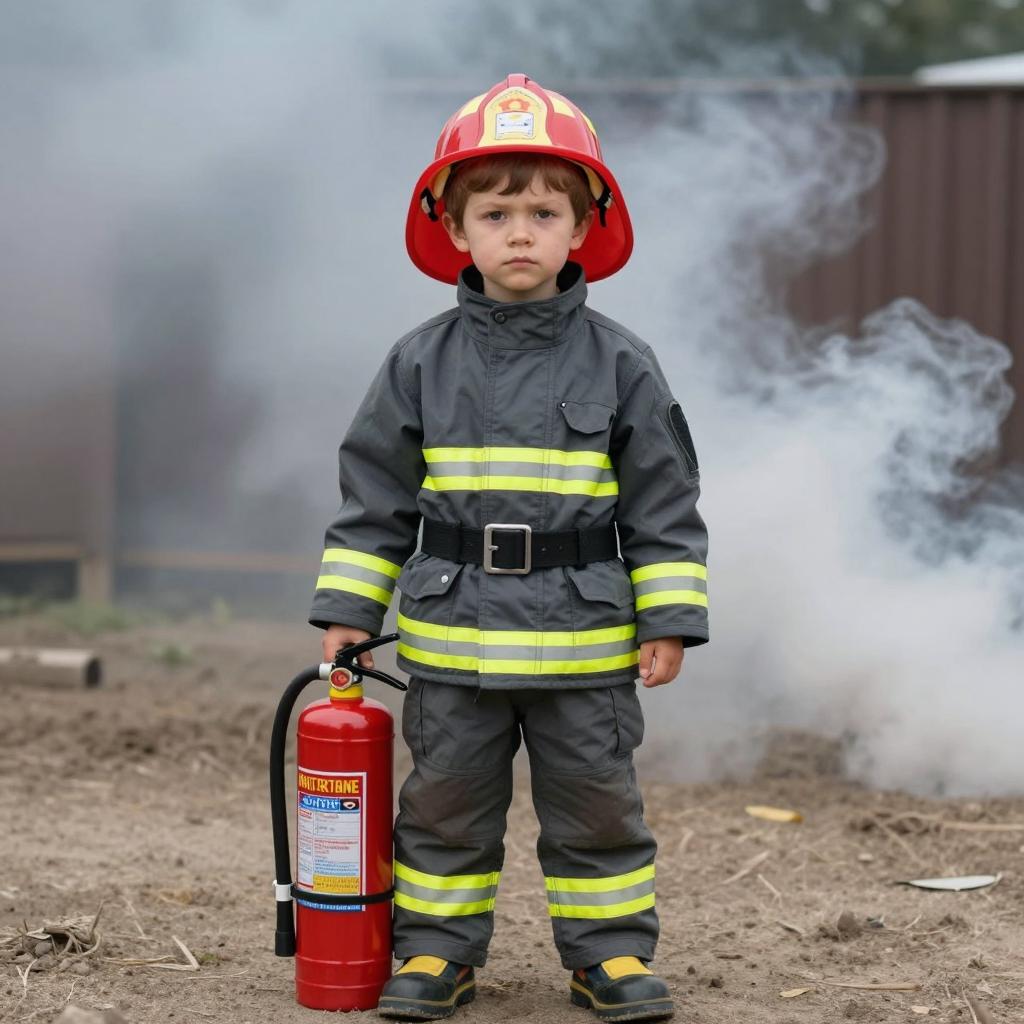 Childrens fancy dress, photorealistic, child standing in front of a smoky background, wearing a red fire helmet, gray fire-resistant suit with yellow reflective stripes, black belt, holding a red fire extinguisher, serious expression, outdoor setting, dirt ground, blurry wooden fence in the background, realistic lighting, daytime, SD/T2I model, high detail, realistic ures, centered composition, child with short brown hair, small size, realistic skin tone, slightly aged look, soft focus on background, emphasis on fire safety theme, realistic shadow and lighting.