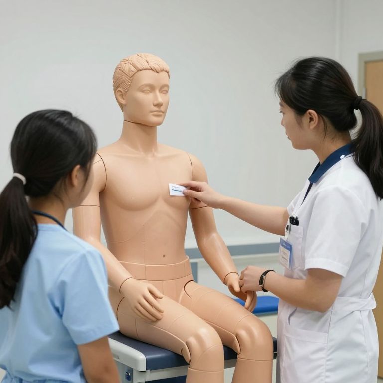 Photograph of two Asian women examining a nude, life-sized, headless male mannequin with jointed limbs. The mannequin, with a smooth, tan finish, sits on a black and gray examination table. One woman, with black hair in a ponytail, wears a white medical uniform and is pointing at the mannequin's chest with a small white tag. The other woman, also with black hair in a ponytail, wears a light blue medical uniform and faces the first woman. The background is a plain, white-walled room with minimal decor. The lighting is bright and even.