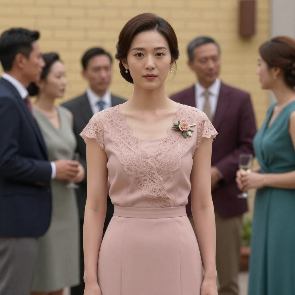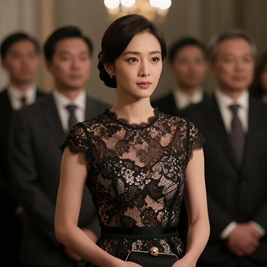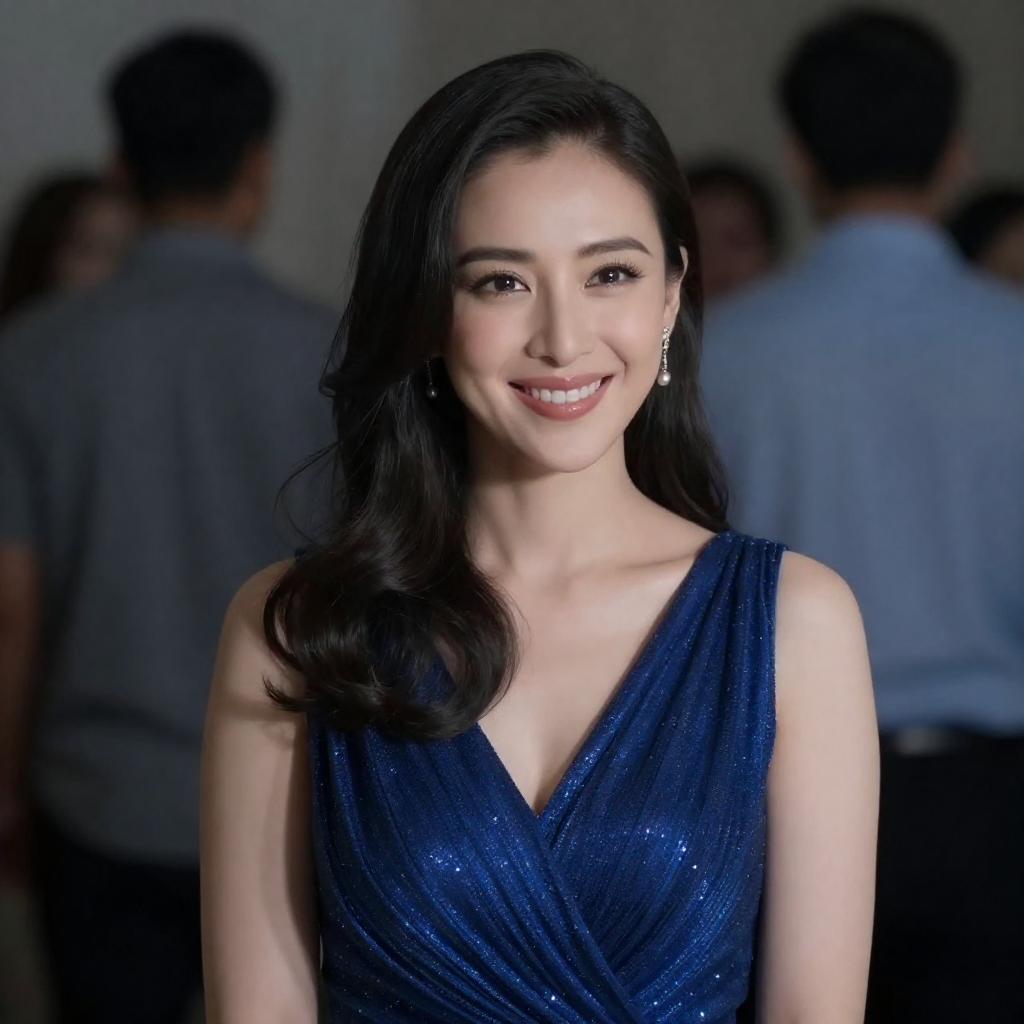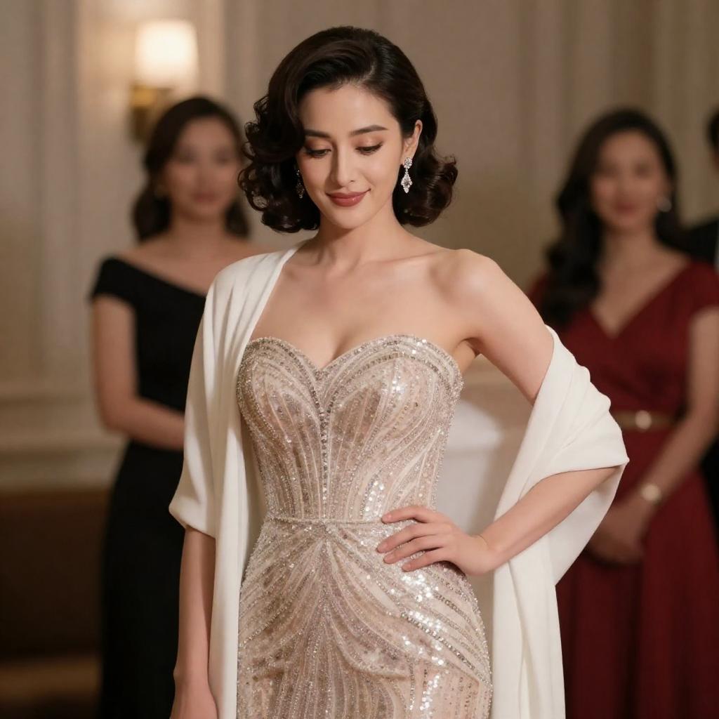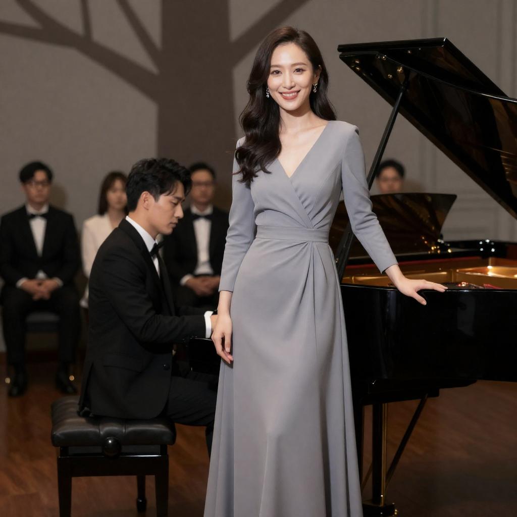 Woman in a gray, floor-length gown with long sleeves, standing beside a grand piano, smiling. Man in a black suit seated at the piano. Background features abstract tree-like patterns. Four people in formal attire seated in the background. Dim lighting.