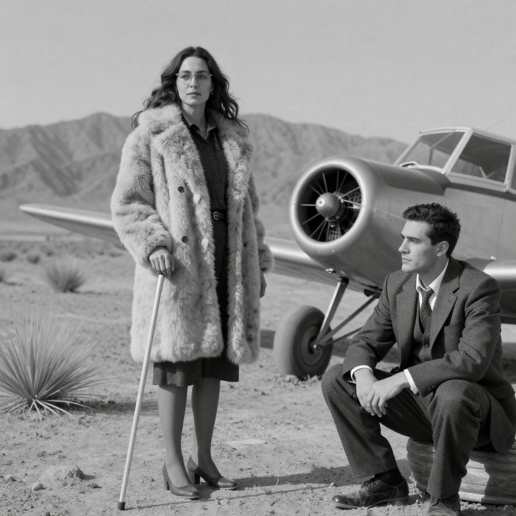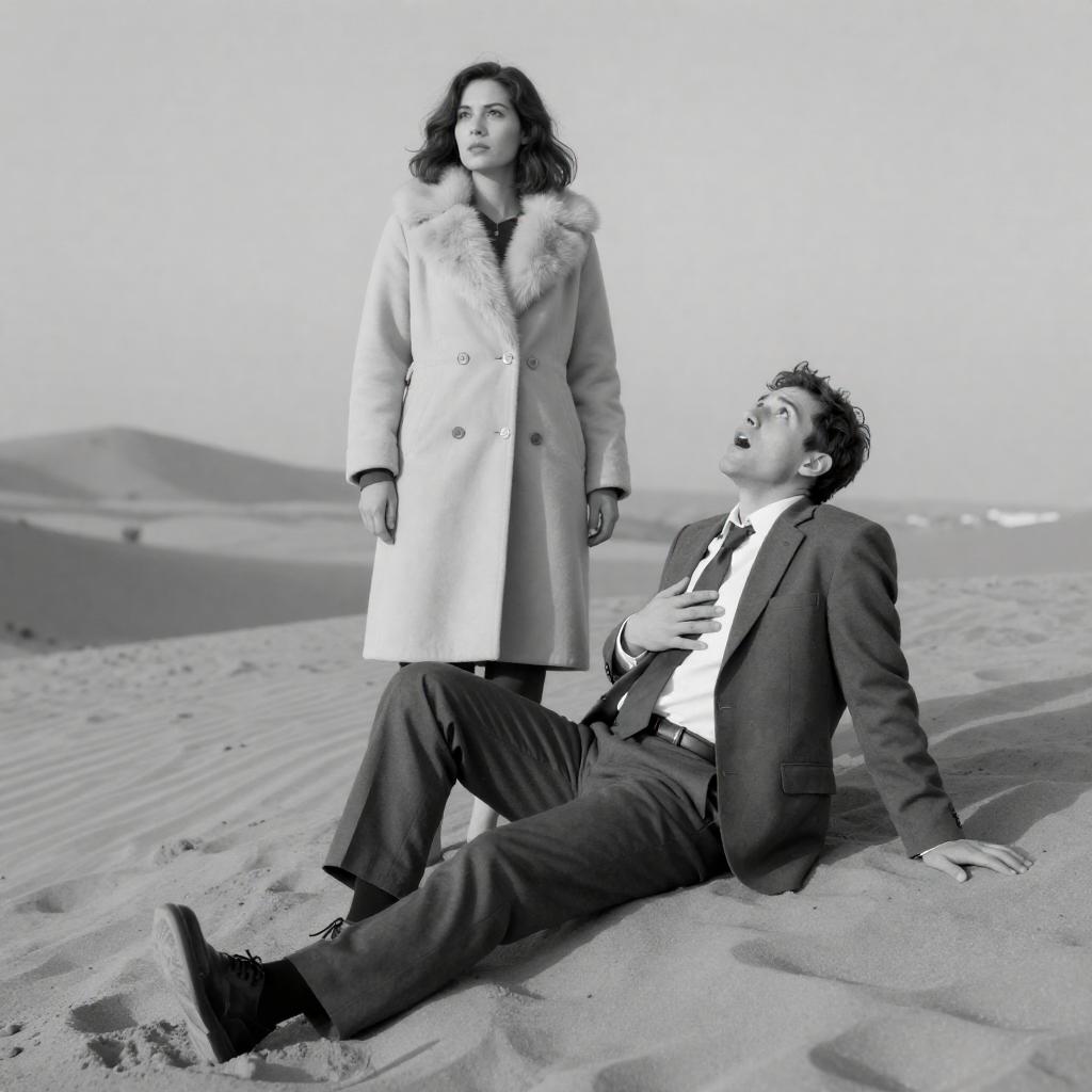 Black-and-white photograph. Woman with shoulder-length hair, light coat, and fur stole stands beside man in suit and tie, reclining on sandy desert hill. Man's head rests back, mouth open, eyes looking up. Desert background, distant hills. Man's legs crossed, woman's right foot forward. Man's left hand on ground, right hand on chest. Both look surprised.