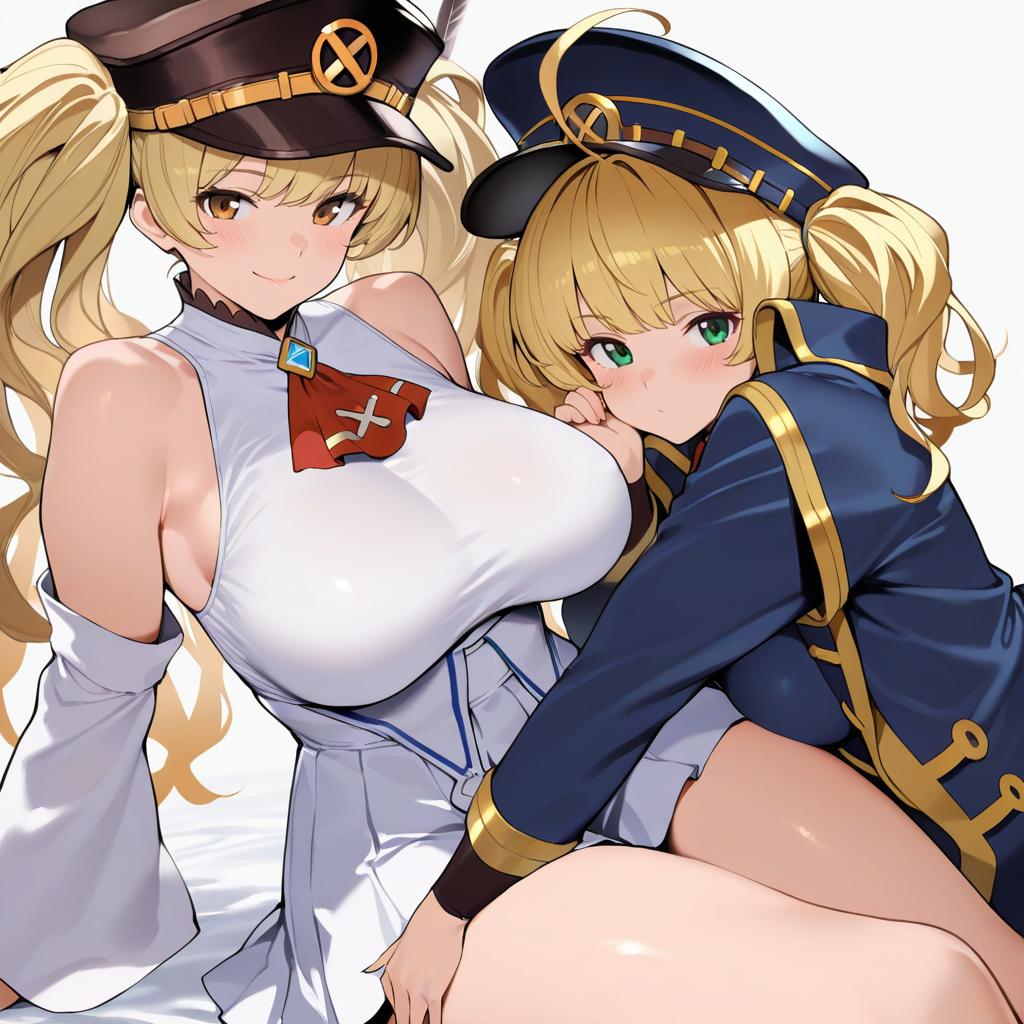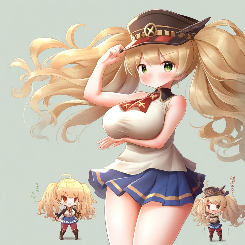 Monika weisswind, granblue fantasy, 1girl, brown eyes, green eyes, blonde hair, long hair, wavy hair, twintails, ahoge, large breasts, thighs, peaked cap, bare shoulders, by artist ks (xephyrks), illustrious