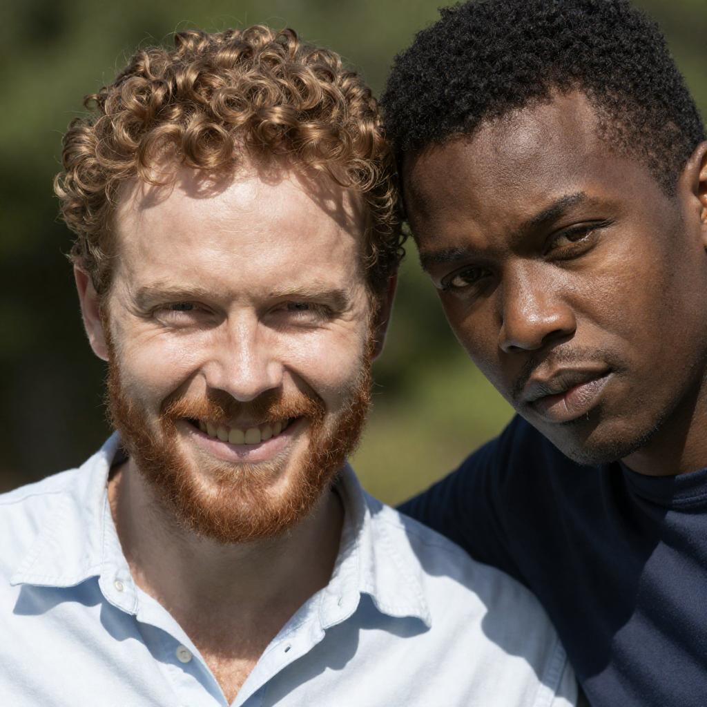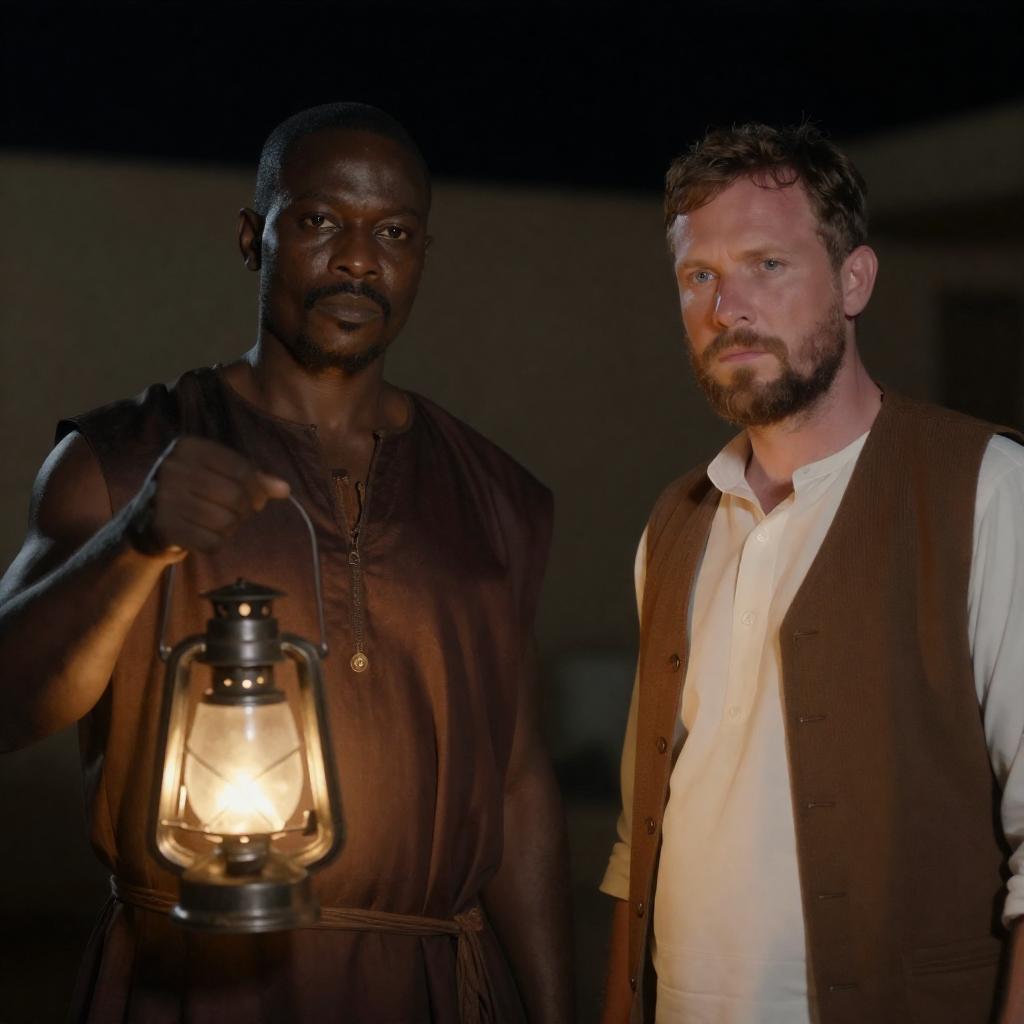 Two men in dim light, African man on left holding lantern, brown robe, muscular, mustache, white man on right, white shirt, brown vest, beard, serious expressions, dark background, lantern's warm glow illuminates faces.
