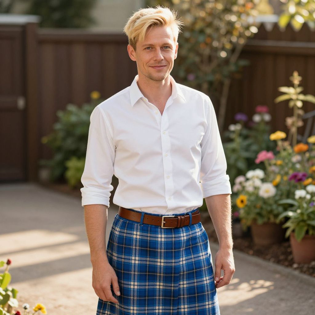 A man with short, vibrant blonde hair stands confidently in a sunlit outdoor setting, wearing a crisp white button-up shirt with the sleeves rolled slightly up, paired with a colorful blue plaid skirt and a brown leather belt. The outfit is both casual and stylish, giving off a playful yet polished vibe. He has a warm, friendly expression, with a slightly relaxed posture, and the scene is softly lit with golden-hour sunlight casting gentle shadows across the ground. The background features a small garden with blooming flowers and a wooden fence, adding a cozy, natural atmosphere.