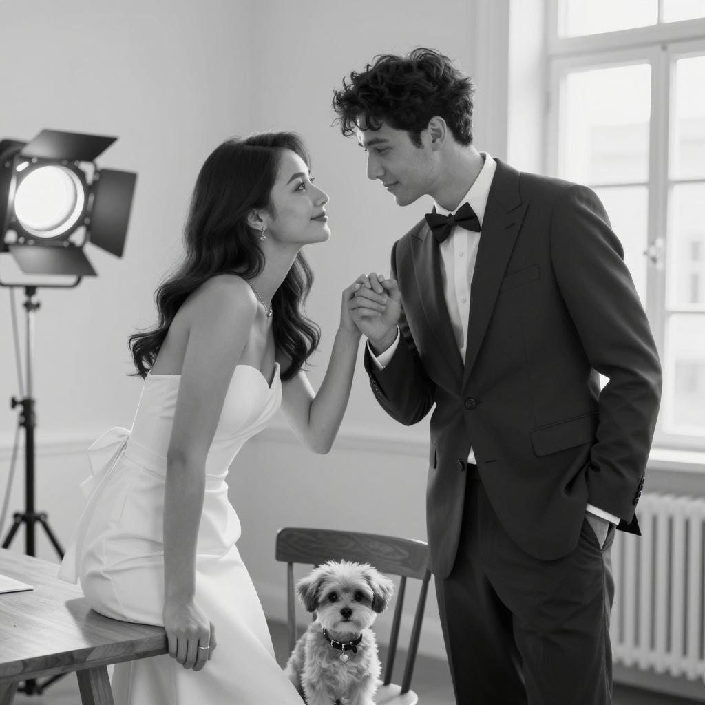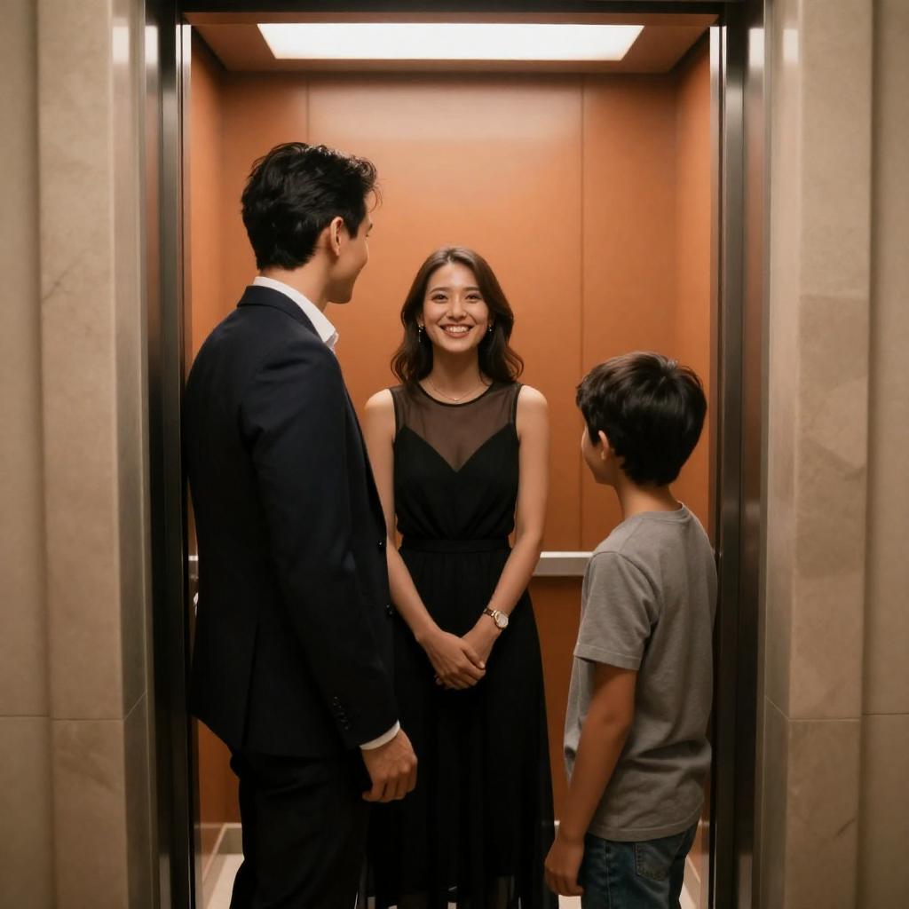 Photograph of three people in an elevator. Woman with dark hair in black sheer dress, standing, smiling. Man in dark suit with short black hair, facing her, holding her hands. Young boy with black hair, facing her, standing to the right. Elevator walls are orange, marble columns on either side. Warm lighting.