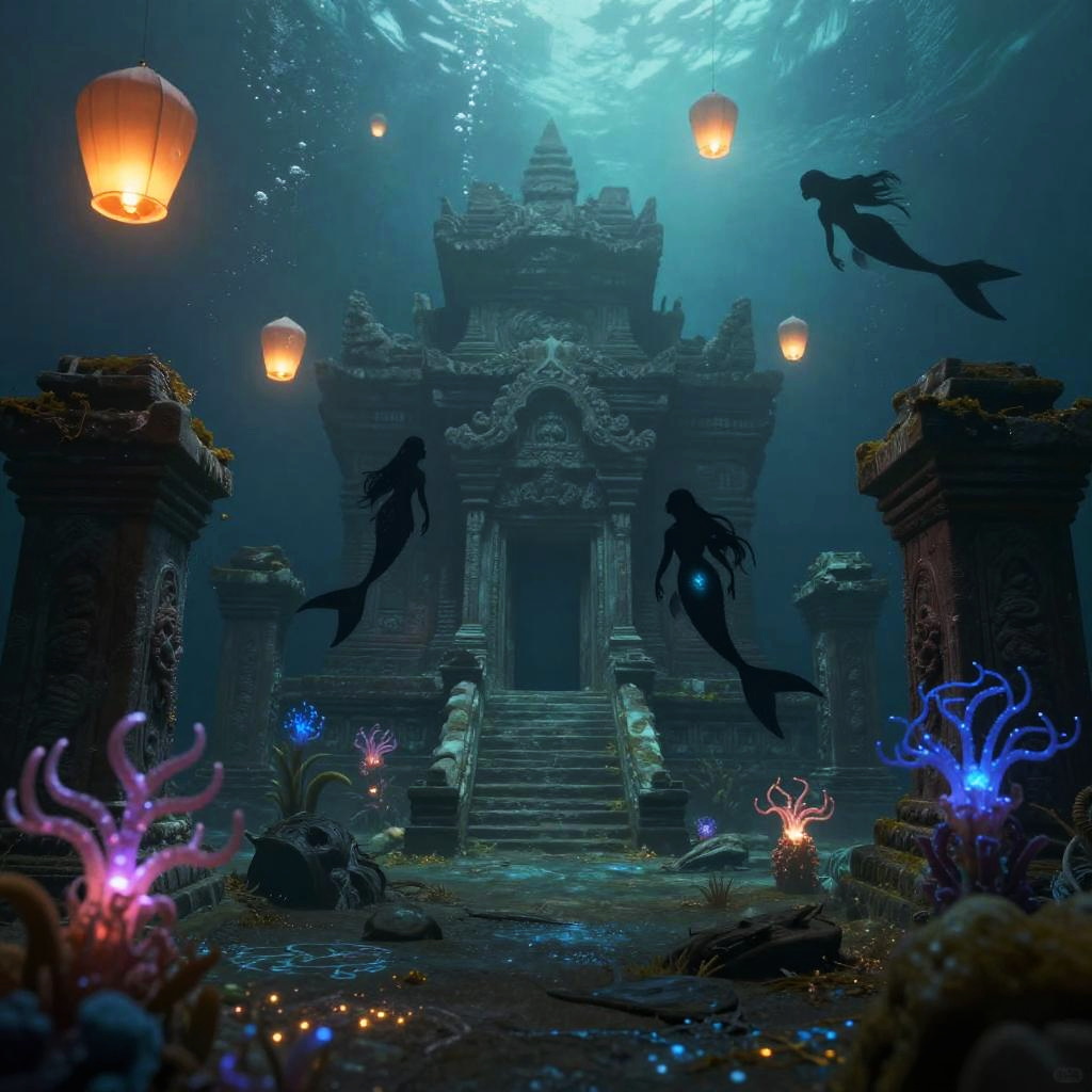 Mysterious aesthetic, surreal underwater scene with floating lanterns, shadowy mermaids, and ancient submerged temple ruins, bioluminescent plants casting eerie glows, dreamlike and mystic mood, highly detailed, vibrant but muted color palette