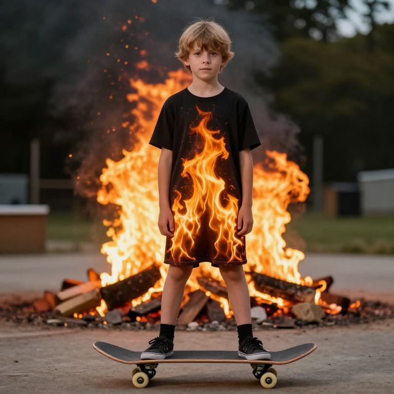Burning Boy Dress, boy standing in front of a fire with a skateboard in front of him