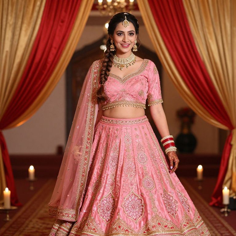 Indian bride in pink, gold-embroidered lehenga and choli, wearing jewelry, standing in ornate room with red and gold drapes