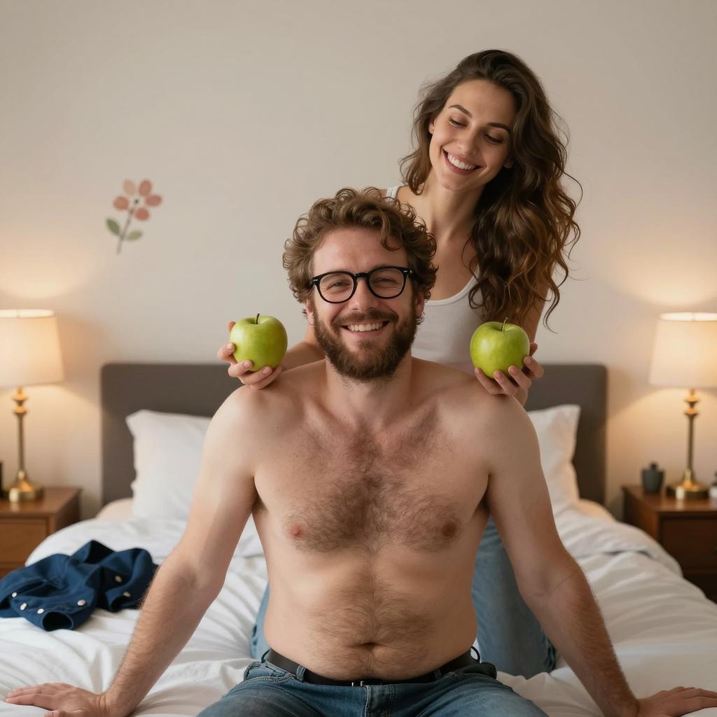 Shirtless man with brown hair and glasses sits on a bed, smiling, with a thick chest hair. Topless woman with brown hair stands behind him, holding two green apples, smiling. Bedroom with floral decorations, lamps, and a blue jacket on the bed. Soft lighting. Two people.