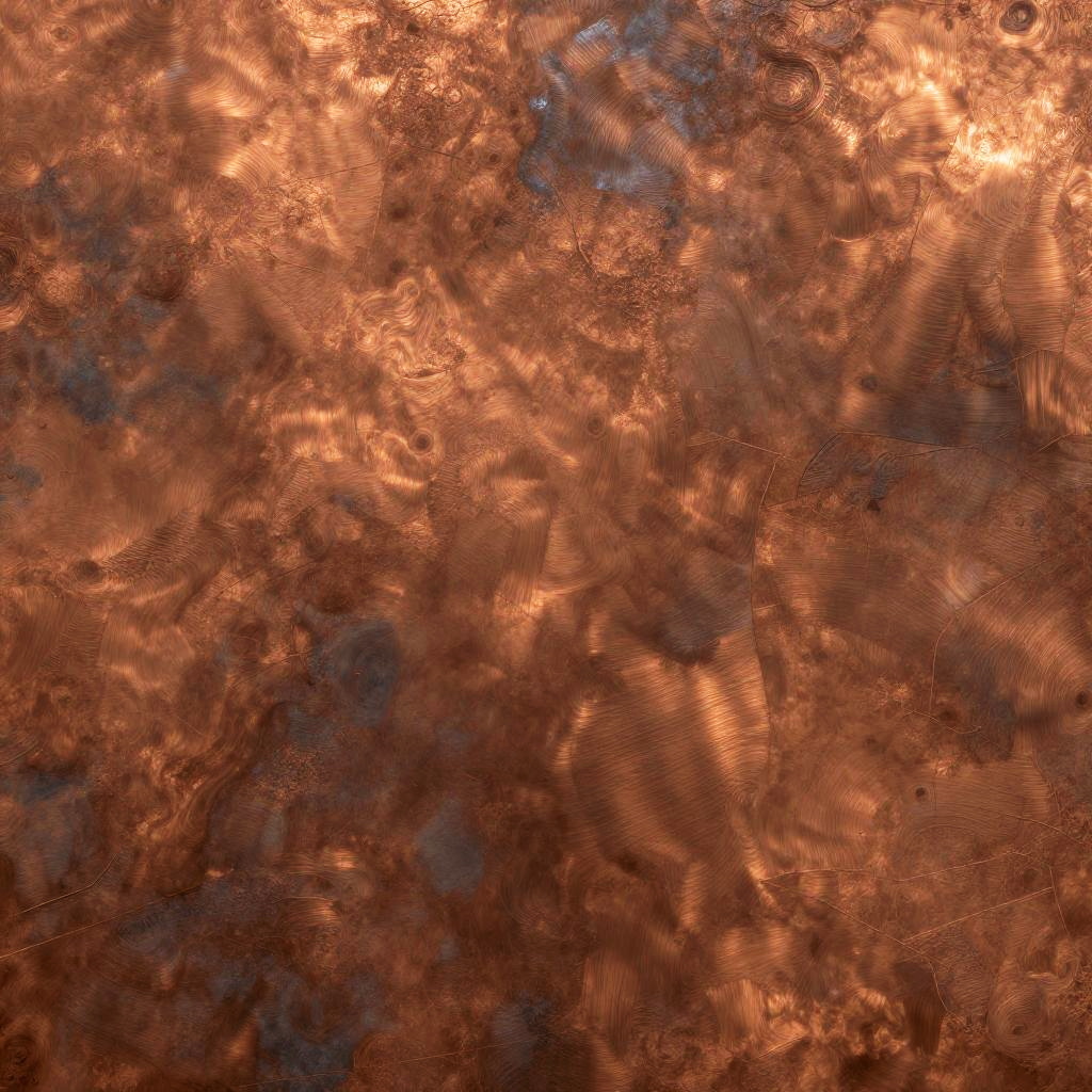 Highly detailed copper seamless texture depicting brushed metal surface with natural imperfections and realistic lighting, warm orange-brown shades with a soft metallic sheen, perfect for use in 3D modeling, graphic design, or fabric prints.