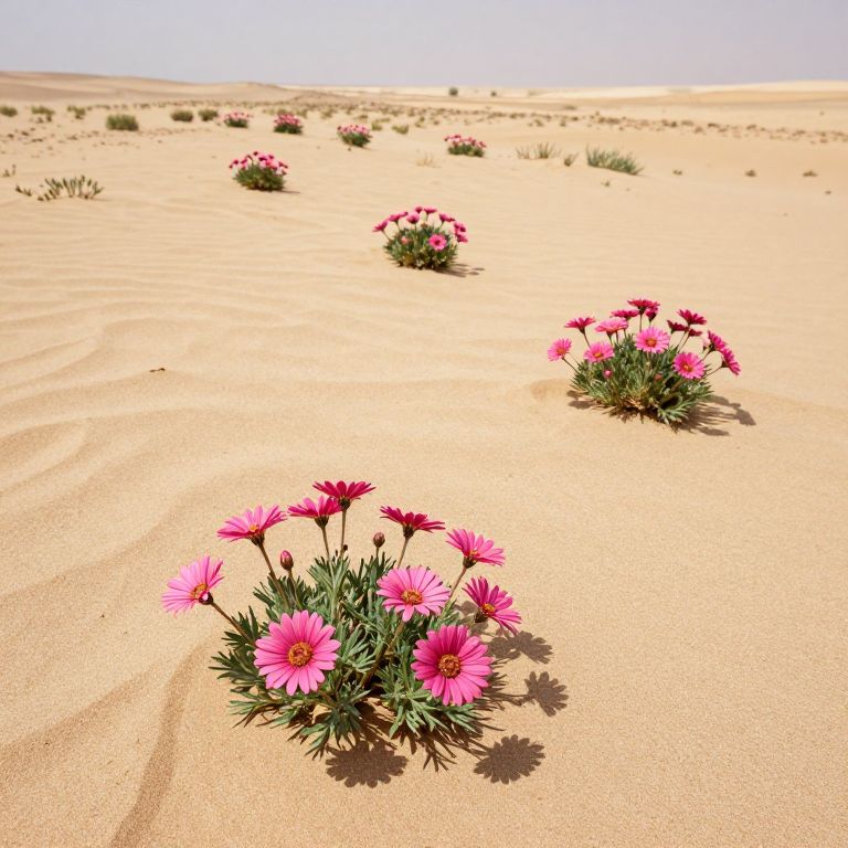 Photograph of a desert landscape featuring several clusters of bright pink daisy-like flowers with green leaves, scattered across golden, rippled sand dunes. The sky is clear and blue, contrasting with the sandy terrain. The flowers are positioned at various distances from the camera, with the closest cluster in the foreground and others fading into the background. Sparse patches of grass are visible in the distance. The overall composition highlights the vibrant flowers against the arid, sandy surroundings, evoking a sense of unexpected beauty in a harsh environment.