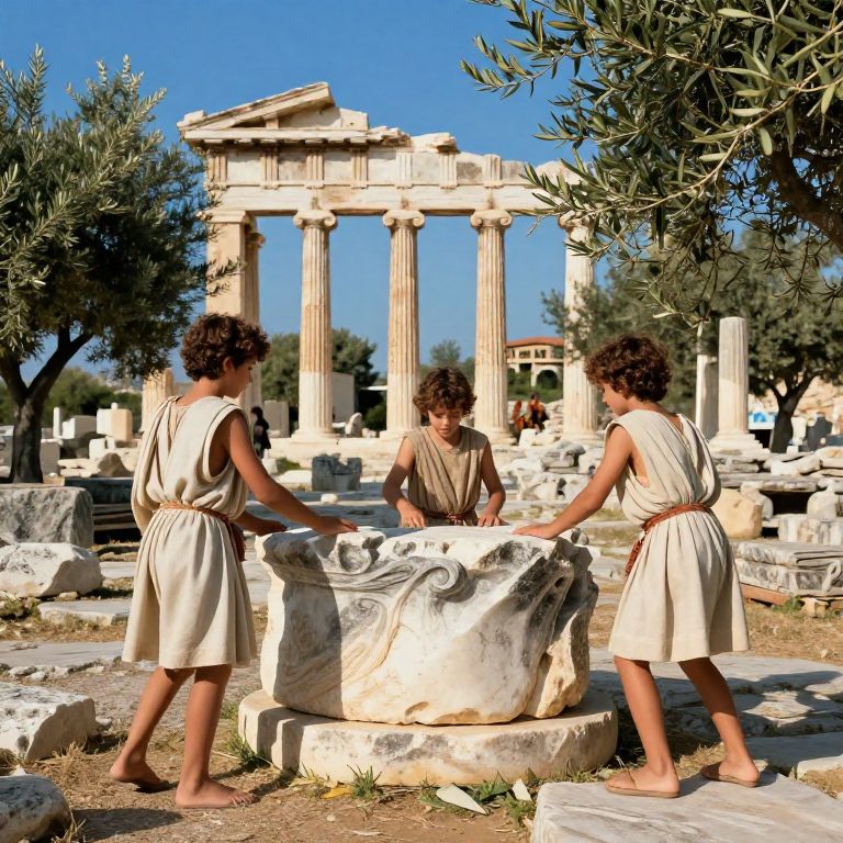 Greek boys with curly hair playing by the ancient marble ruins under a bright blue sky, wearing traditional light tunics, surrounded by olive trees, soft golden sunlight casting gentle shadows, vibrant and detailed scene, classical Mediterranean atmosphere.