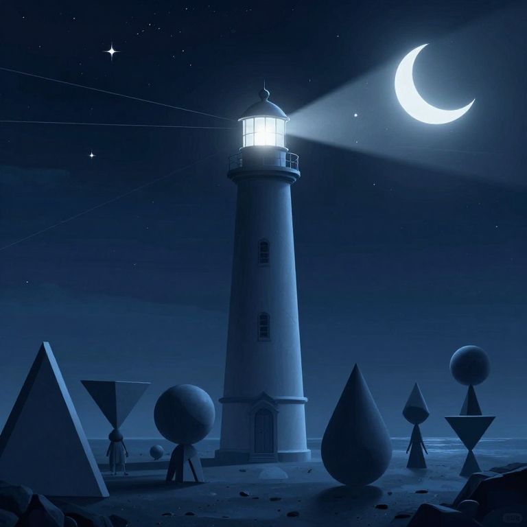 An atmospheric digital illustration depicts a serene coastal scene featuring a towering lighthouse emitting ethereal triangular beams of light, surrounded by a council of sentient geometric shapes—triangles, spheres, and teardrops—that appear to engage in philosophical debate under a starry night sky with a crescent moon and celestial lines, evoking a surreal and contemplative mood.