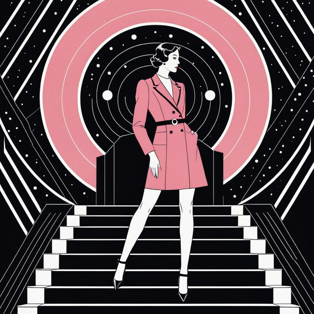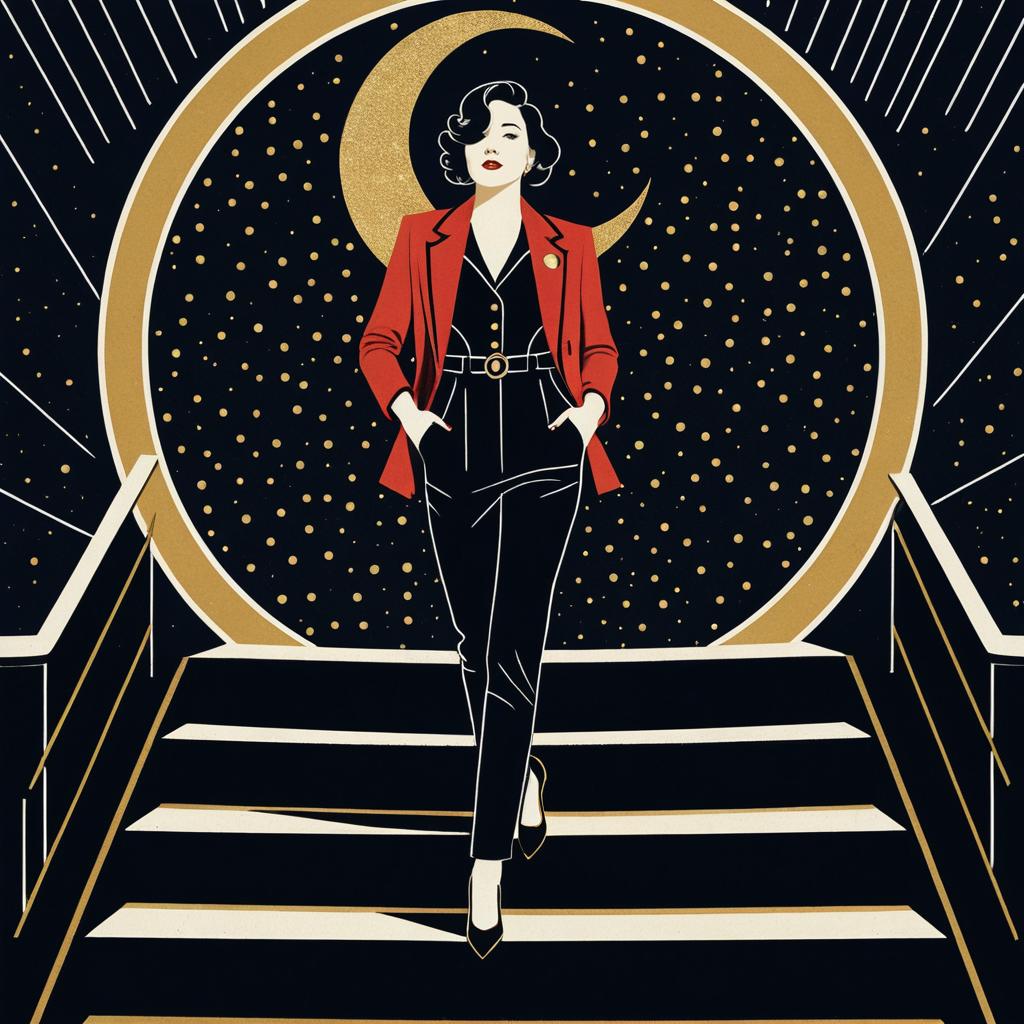Minimalist art deco style illustration of a confident female jazz musician standing on black stairs. The figure is dressed in a black jumpsuit with a red blazer, set against a black background featuring gold and silver geometric crescent shapes and scattered golden dots. The design uses simple lines and a dramatic pose to evoke a vintage poster aesthetic with a mysterious atmosphere.