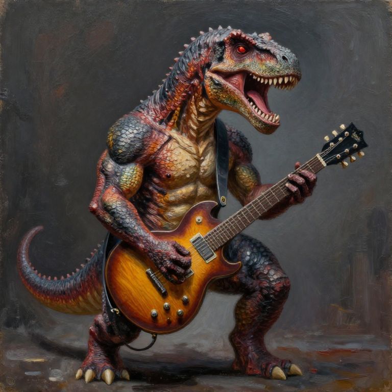 "Scumbling anthropomorphic dinosaur, playing guitar, heavily muscled, heavy metal style, oil painting.,"