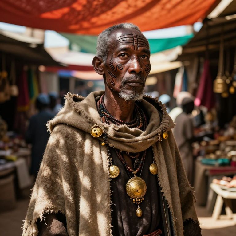 Envision a captivating portrait photograph of an enigmatic East Asian sorcerer amidst the lively atmosphere of an African marketplace. The subject, weathered by time and adorned with intricate tribal scars, wears a tattered cloak embellished with golden amulets. Standing in dappled sunlight beneath vibrant awnings, his silhouette contrasts against the bustling stalls and crowds beyond. His wise eyes exude an air of knowledge, holding secrets that evoke a spectrum of emotions from curiosity to awe. This ultrarealistic portrait captures the essence of ancient wisdom.