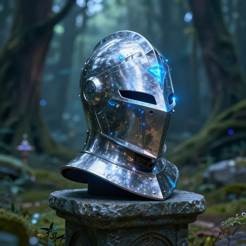 Fantasy knight helmet with a sleek, futuristic design, illuminated by blue ethereal light, resting on a stone pedestal in a enchanted forest glade, hyper-detailed and dramatic