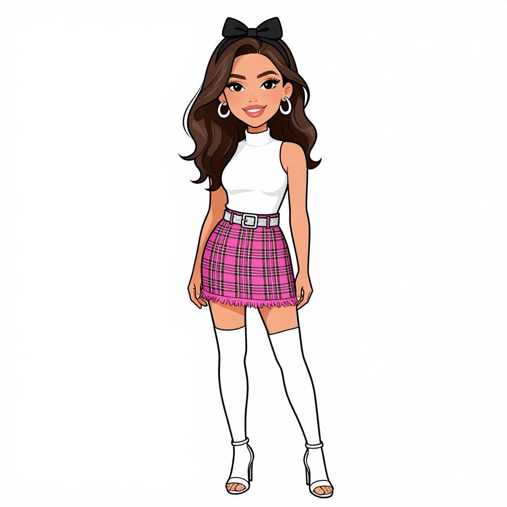 Digital illustration of a confident woman with long black hair, wearing a pink sleeveless crop top and matching skirt, accessorized with hoop earrings and a ch