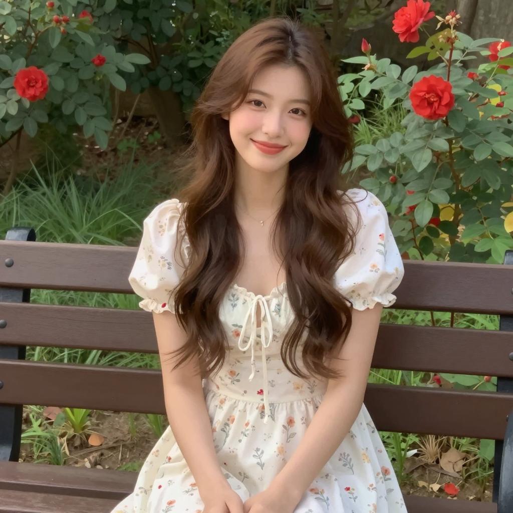 Young woman with long dark hair, smiling, wearing a pink and cream varsity jacket with yellow lettering, white crop top, and high-waisted denim shorts. Standing against a white wall, next to a bookshelf. Light wooden floor. Natural light.
