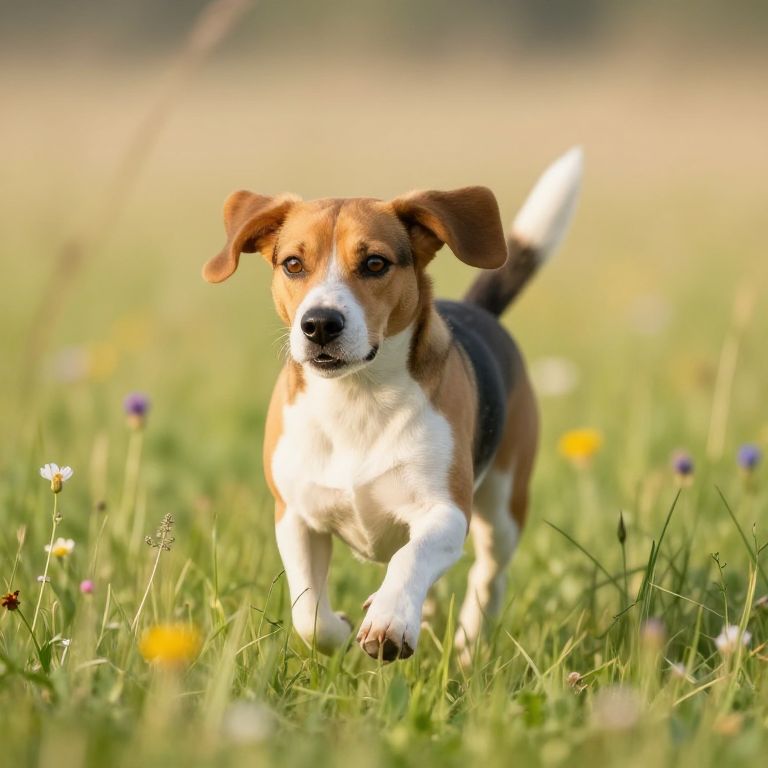 Rhodesian Beagle running through a meadow dotted with wildflowers, early morning light, soft focus background with tall grass swaying, energetic pose, detailed eyes and nose, highly detailed, natural color palette.
