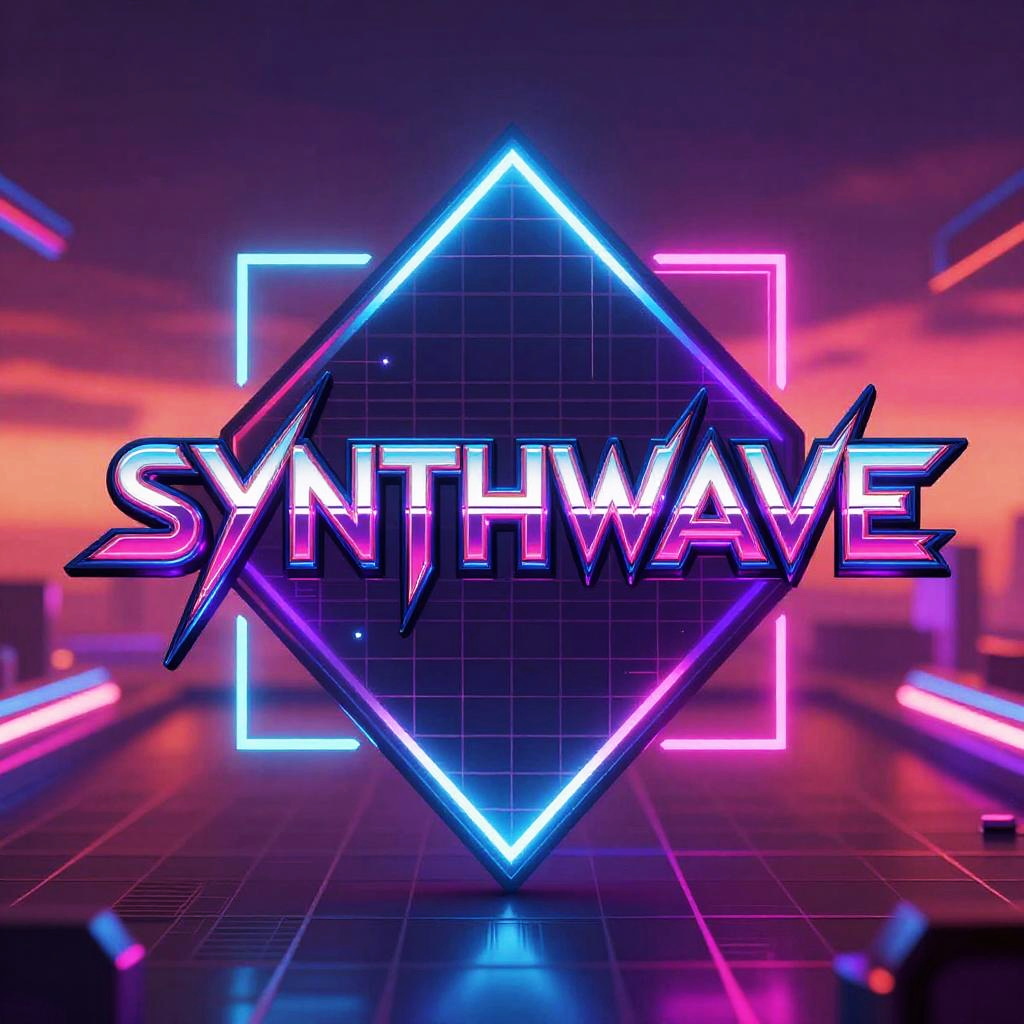 Synthwave logo maker design featuring neon pink and electric blue hues, futuristic grid background with glowing geometric shapes, sharp stylized typography in retro 80s style, vibrant sunset gradient sky, cyberpunk aesthetics, high contrast metallic details.
