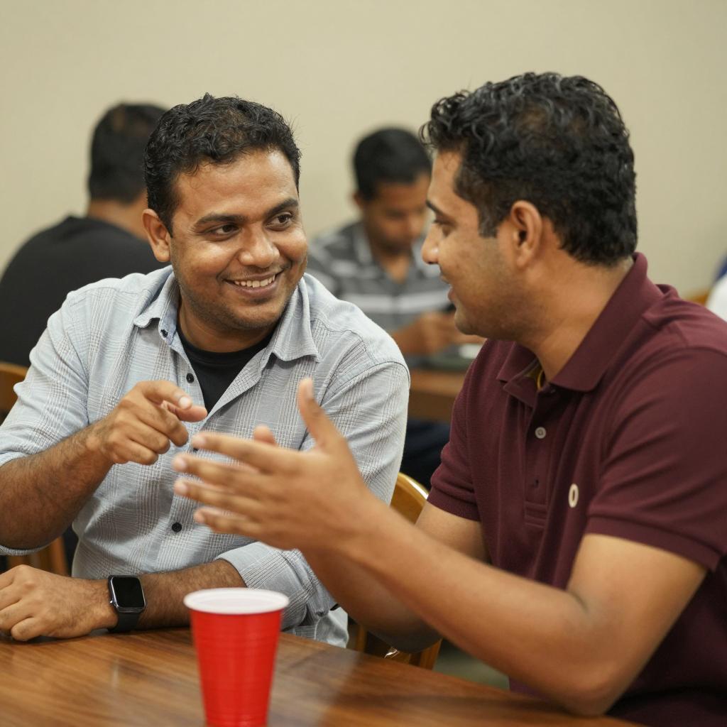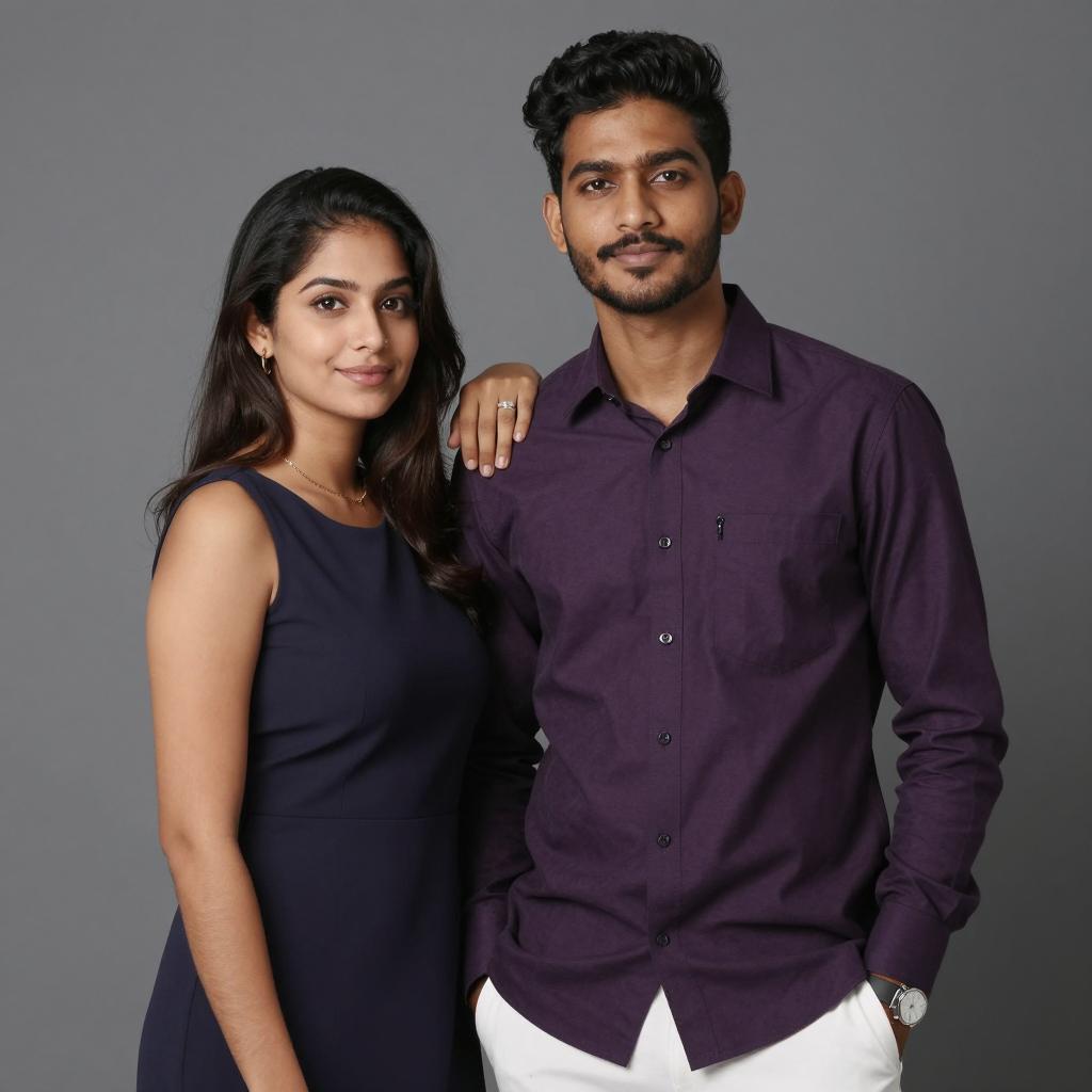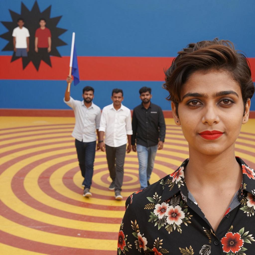 Six people stand together outdoors against a bright sky with clouds. Five men in patterned shirts, plaid jackets, and sunglasses, one man with glasses and a leather jacket. One woman with curly hair, orange sweater, and patterned skirt. Men make various hand gestures, woman hugs man on the right. Bright, colorful clothing. Group poses close together.
