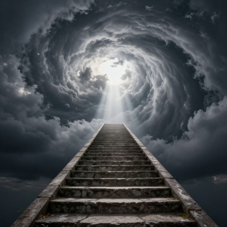 Photograph of a steep, stone staircase leading upwards into a swirling, stormy sky with intense, bright light at the top.