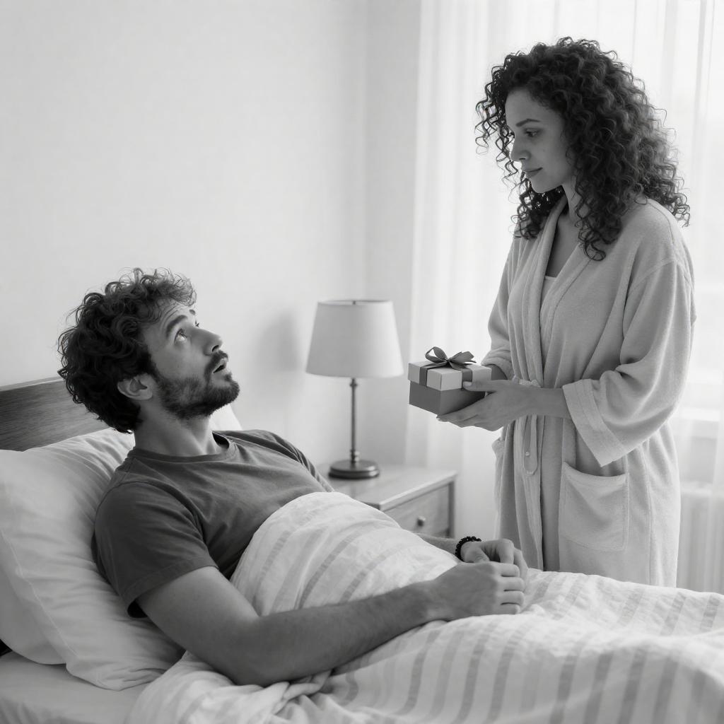 Black-and-white photograph of a man in a bed with a striped blanket, looking up at a woman with curly hair. Woman stands next to the bed, holding a small gift box. Man has curly hair and a beard, looking surprised. Bedside table with a lamp in the background. Woman in a light robe. Bright window in the background.