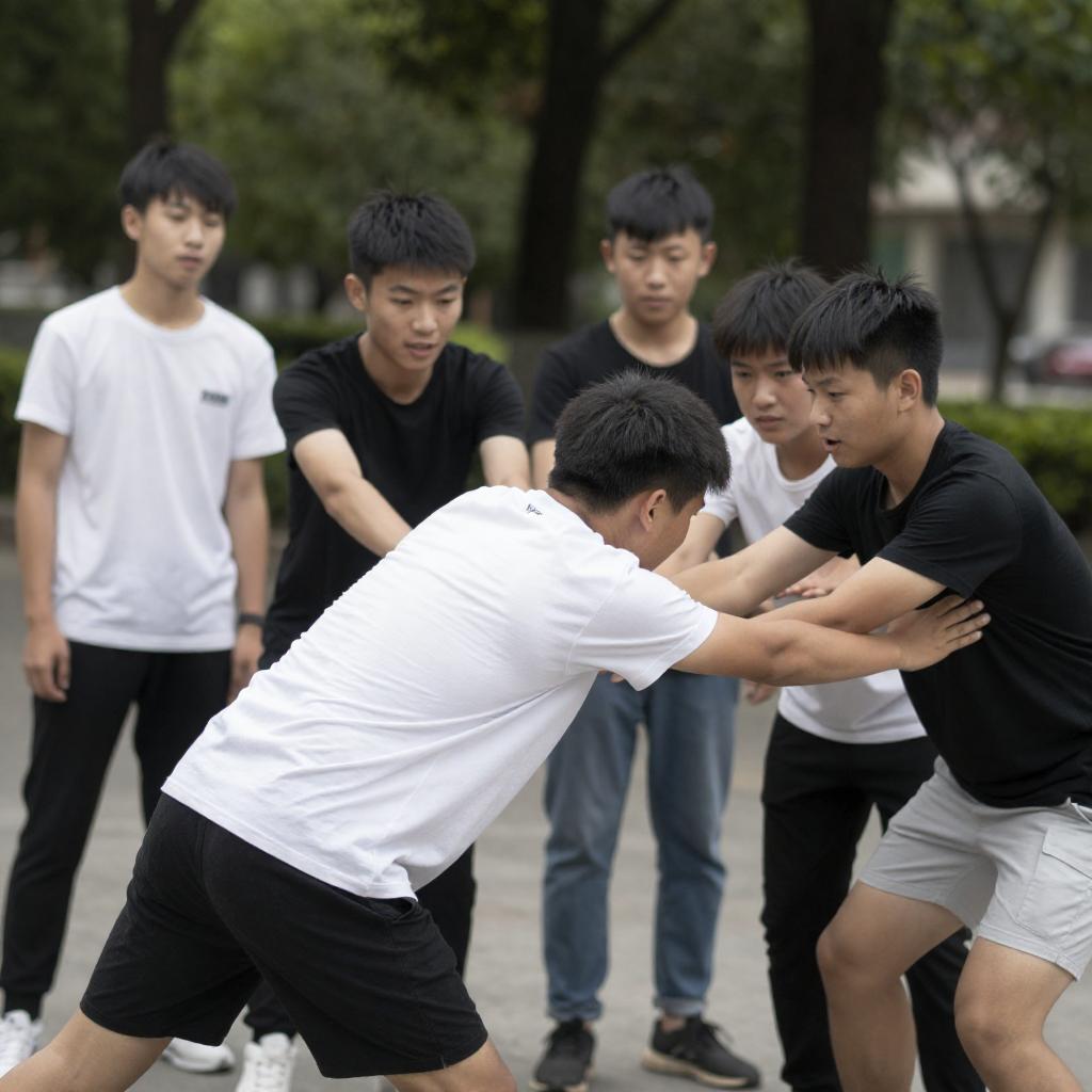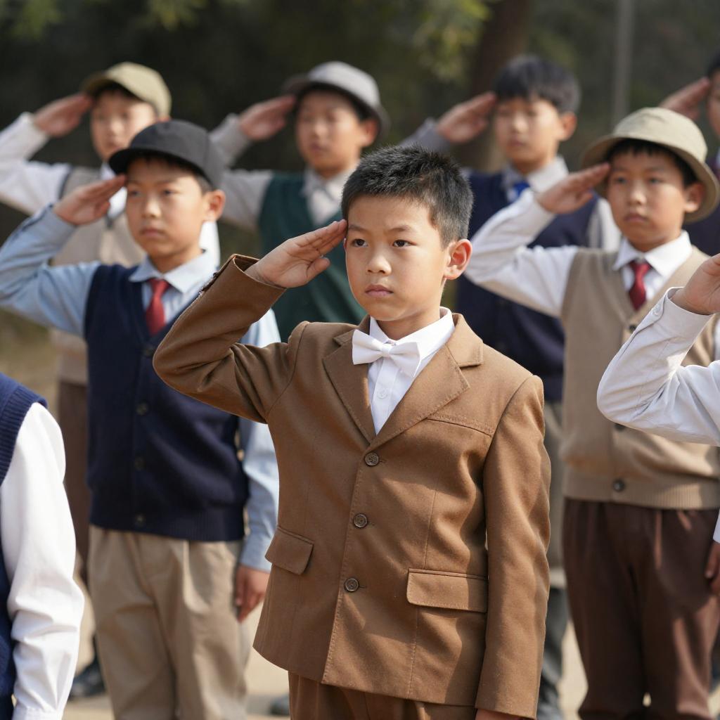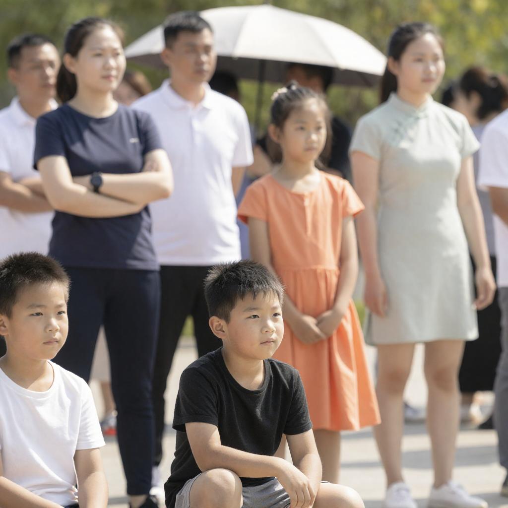 Photograph of a lively outdoor scene with a group of Asian people, including children and adults, standing and sitting. A young boy in a black shirt sits in the foreground, while a girl in an orange dress stands behind him. People wear traditional and modern clothing, and a white umbrella is visible in the background. Bright sunlight illuminates the scene.