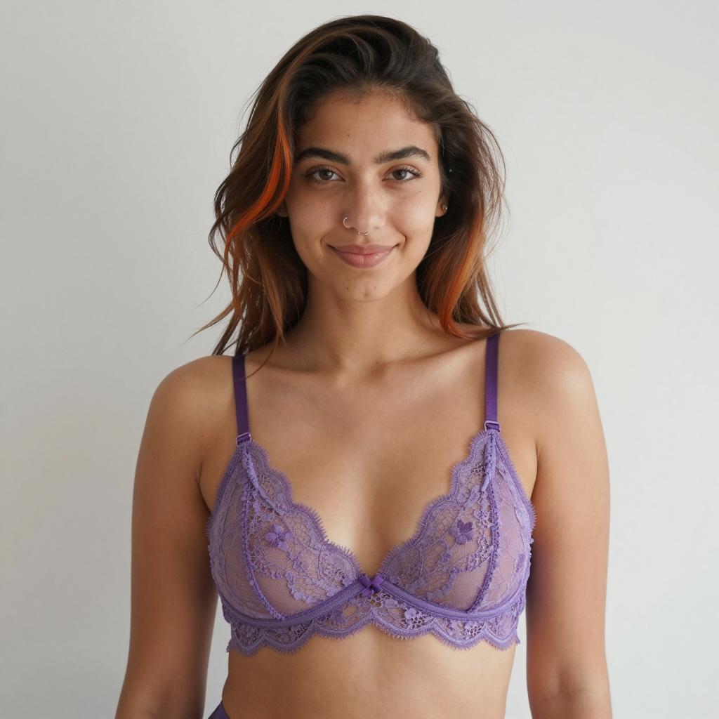 Portrait of a young woman with long, tousled, dark brown hair wearing a matching lilac purple lace lingerie set, standing against a vibrant purple background. She has a warm smile and clear skin, portraying confidence and joy. The setting includes subtle decor elements like a white table and a pink vase with flowers, enhancing the cheerful atmosphere.