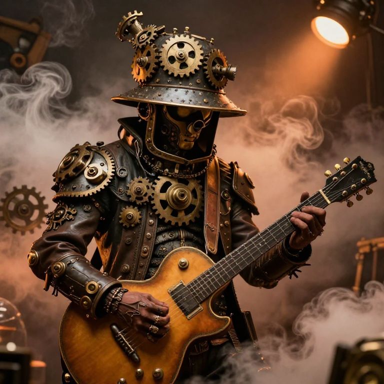A steampunk-inspired scene featuring Buckethead with gears and cogs integrated into his bucket helmet, playing a vintage guitar with brass accents, surrounded by clouds of steam and glowing orange light, intricate details and a warm color palette.