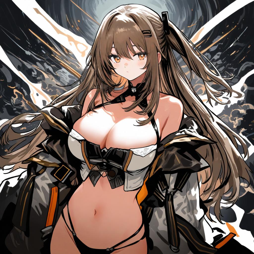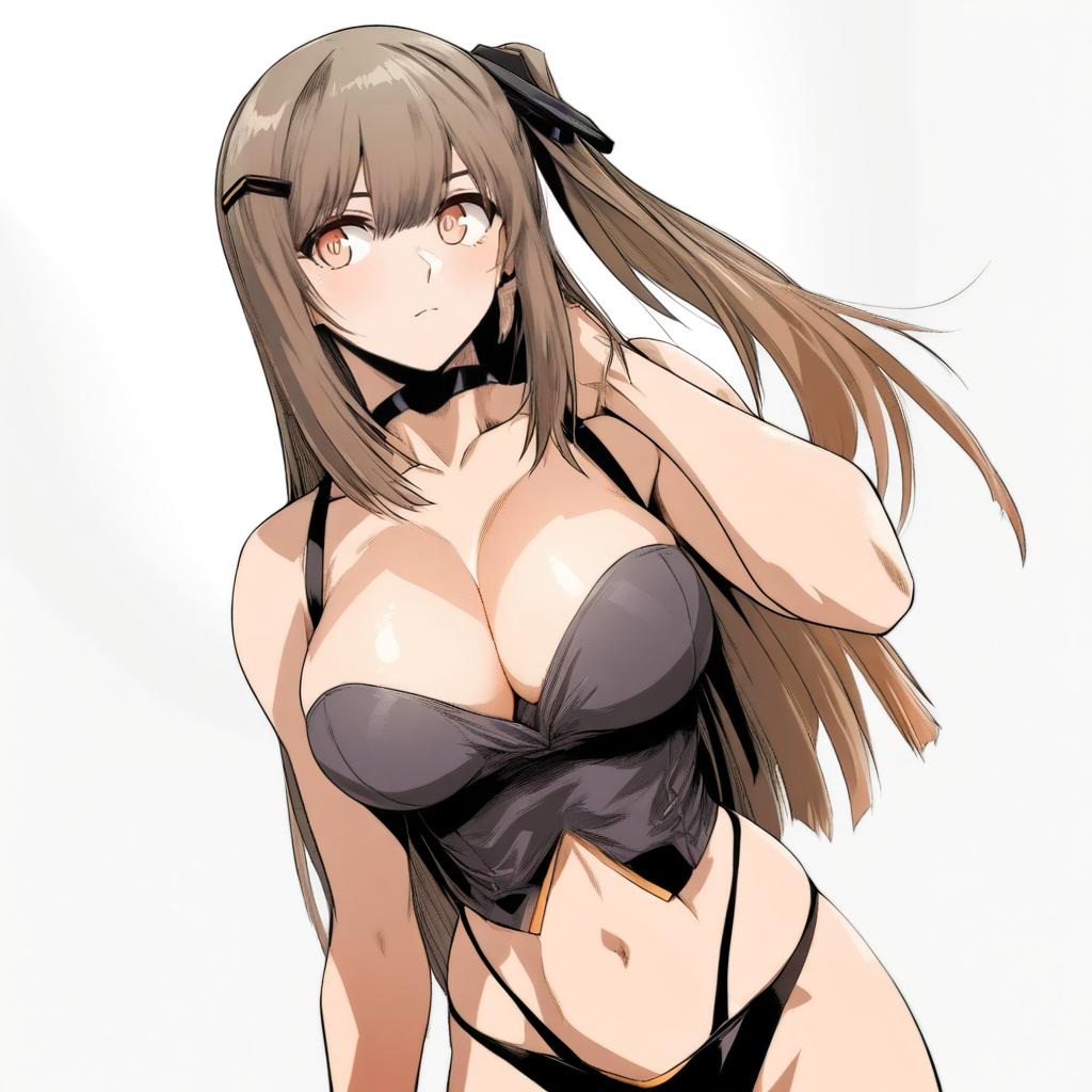 K2 (girls' frontline), girls' frontline, 1girl, brown eyes, hair between eyes, brown hair, long hair, sidelocks, hairclip, medium breasts, large breasts, cleavage, navel, collarbone, black panties, bare shoulders, one side up, by artist ez6, animagine