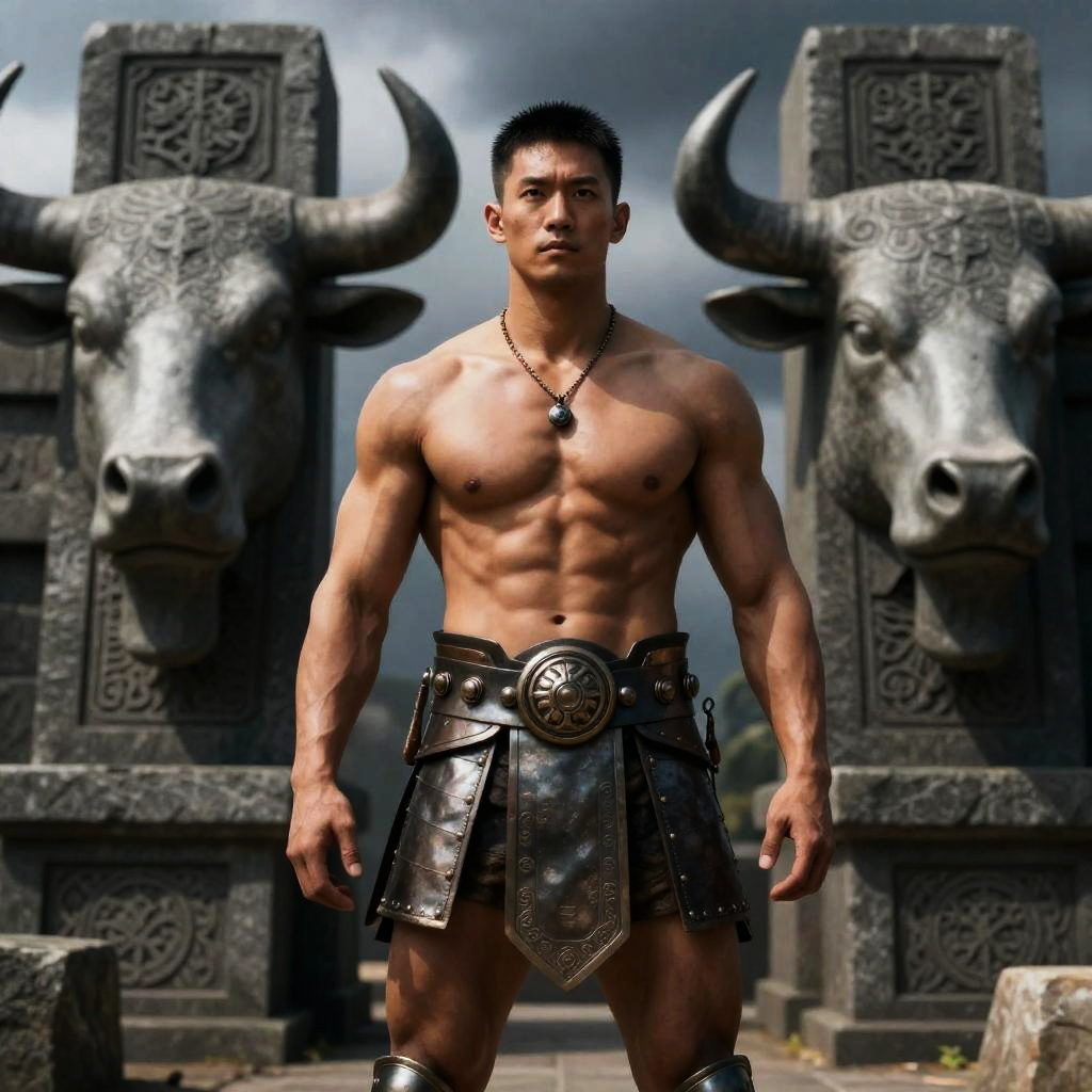 Muscular man stands center, wearing minimal metallic armor and necklace, between two large stone bull heads. Background has detailed stone carvings. Dark, cloudy sky. Man's expression is serious. Filmic, dramatic lighting. Realistic CGI style.