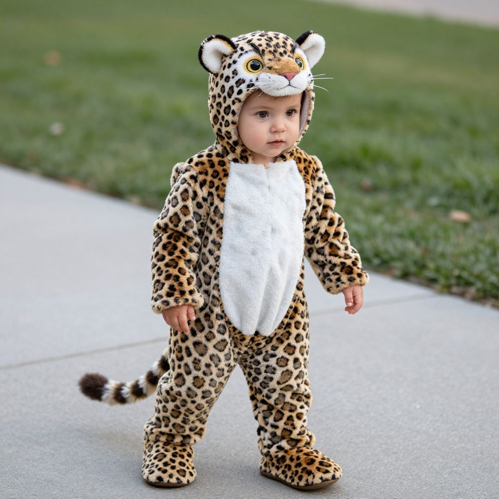 Snow Leopard Toddler Costume, baby in a leopard costume standing on a sidewalk