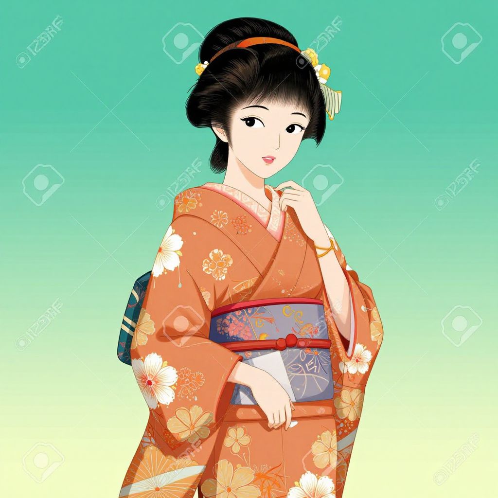 This digital illustration depicts a young Japanese woman in a traditional orange kimono adorned with white floral patterns. She has fair skin, black hair styled in an updo with a red hairpin, and wears a blue obi sash with a floral design. Her right hand is gently touching her chin, and her left hand rests by her side. She has a subtle smile and a calm expression. The background features a gradient from turquoise to yellow. The style is colorful and clean, with a focus on traditional Japanese aesthetics. The image has a watermark from 123RF in the top corners.