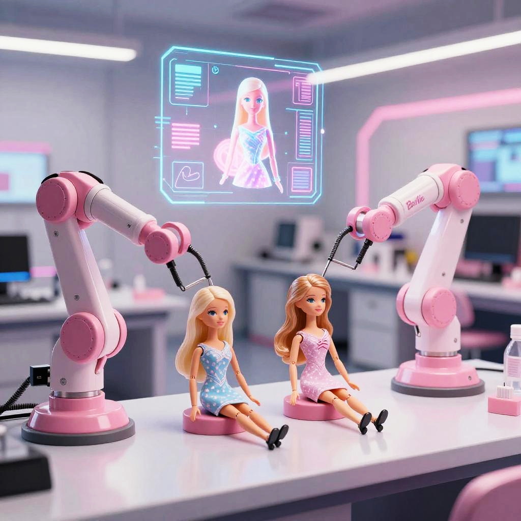 Barbie AI generator laboratory environment, featuring robotic arms assembling dolls with intricate detail, a vibrant pink and white color scheme, holograms showcasing AI design patterns, reflecting an innovative and playful tech atmosphere