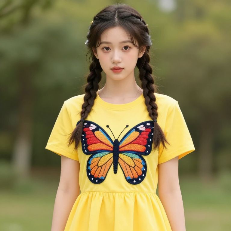 Girl with braids in her hair, wearing a yellow dress with a colorful butterfly design on the front.