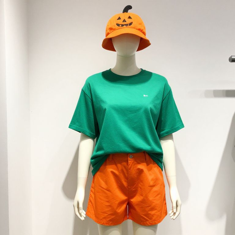 Mannequin wearing a green shirt with orange shorts and a pumpkin hat.