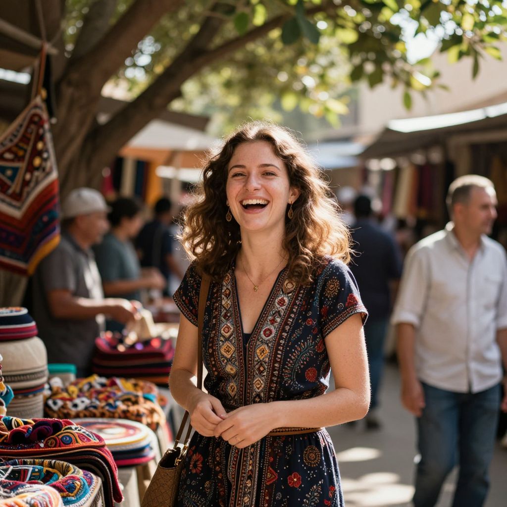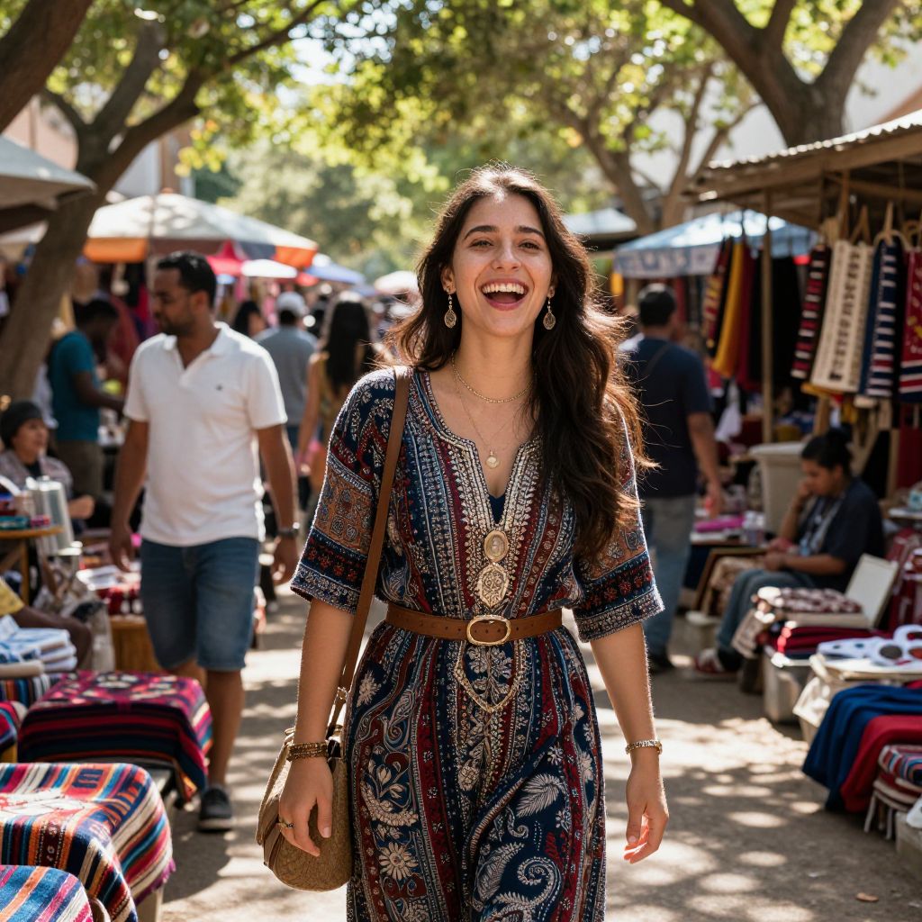 Radiant joy and cultural vibrancy intertwine beneath the sun-drenched canopy, as a woman’s laughter echoes through the market, weaving a tapestry of warmth, freedom, and timeless connection.