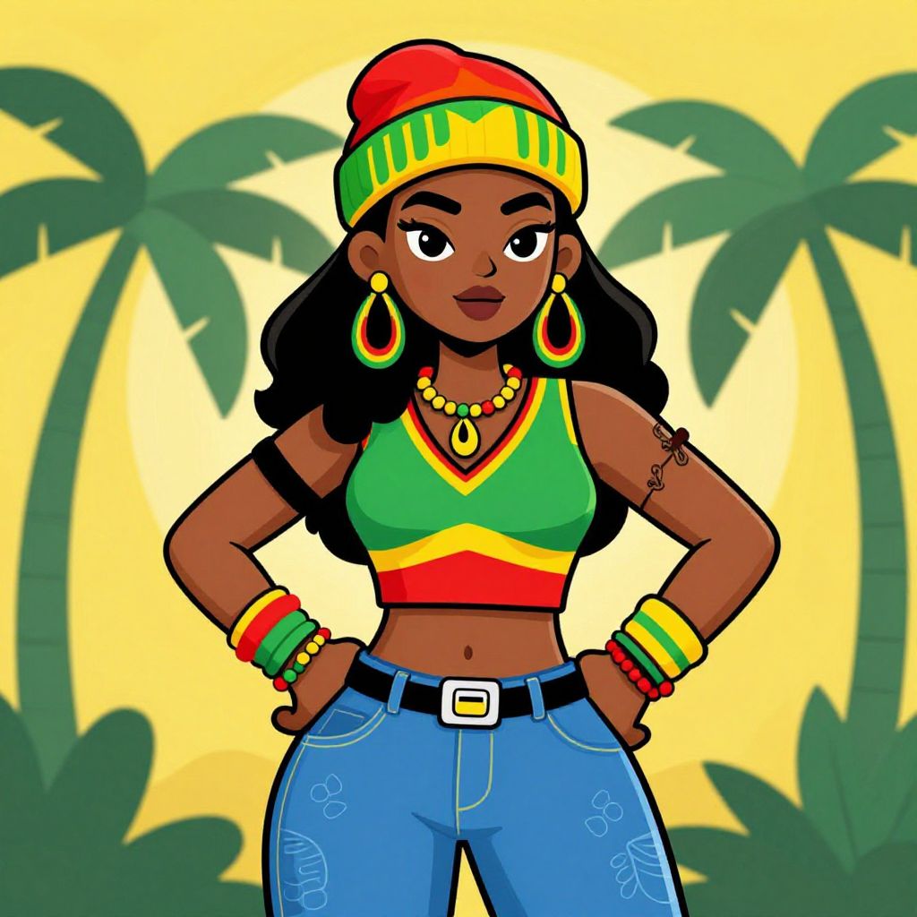 A bold and fun cartoon illustration of a Rastafarian pin-up woman wearing a colorful beanie in red, green, and yellow. She sports a reggae-inspired outfit with a green top featuring red and yellow accents, blue denim pants, and various matching accessories including large earrings, bracelets, and a necklace. The background includes stylized palm trees and a vibrant color palette evoking reggae and Rastafarian culture vibes.