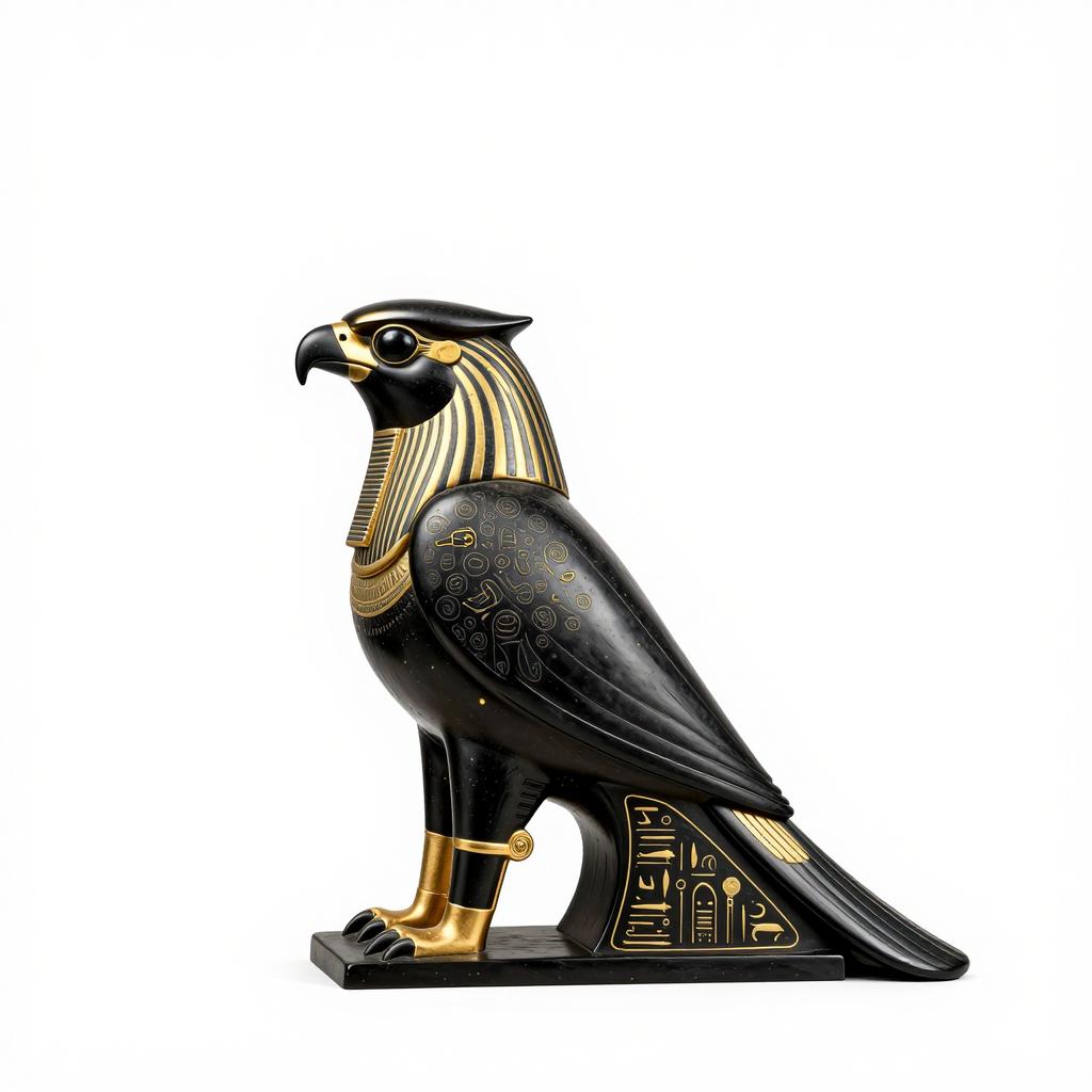 An exquisite illustration of Egyptian falcon statue, crafted in ancient hieroglyphic carving with jet black and deep gold highlights, set against a vast white negative space, UHD, 16K, ultra-detailed.